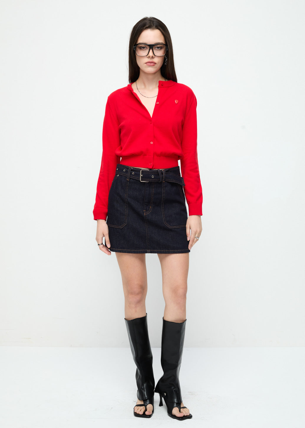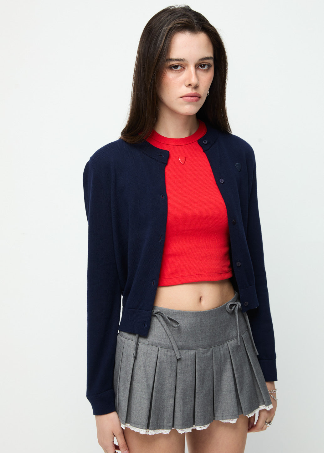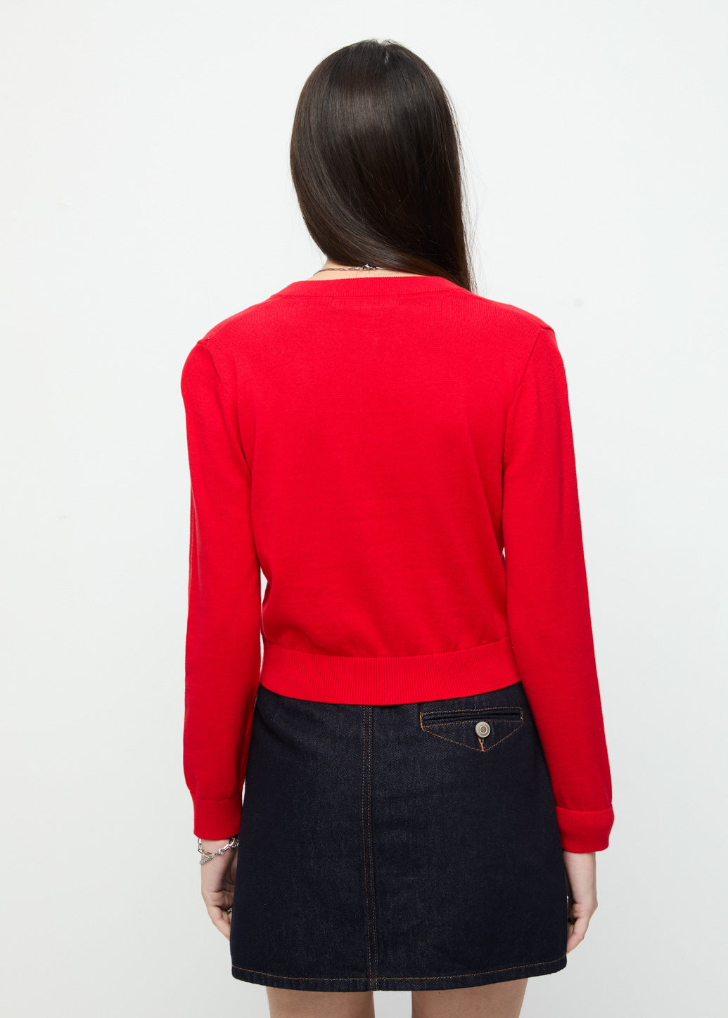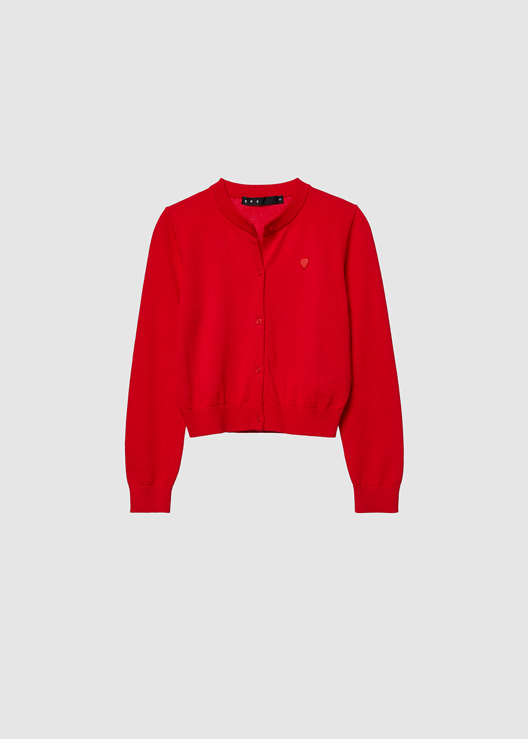 A cropped knitted cardigan with a modern edge, highlighted by a tonal guitar pick logo on the chest. Finished with ribbed detailing along the neckline, cuffs, and hem to define the silhouette of a chic yet minimal aesthetic. Perfect for mixing and matching with soft-toned items to get into feminine looks.