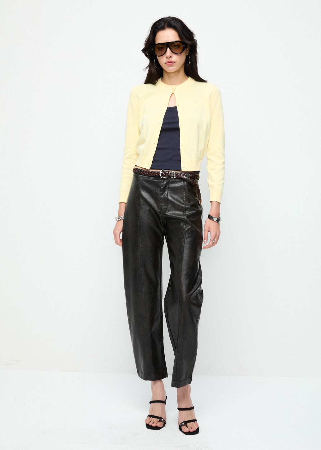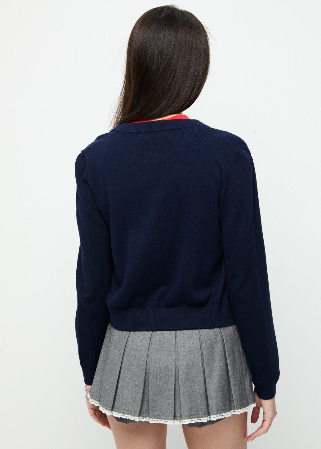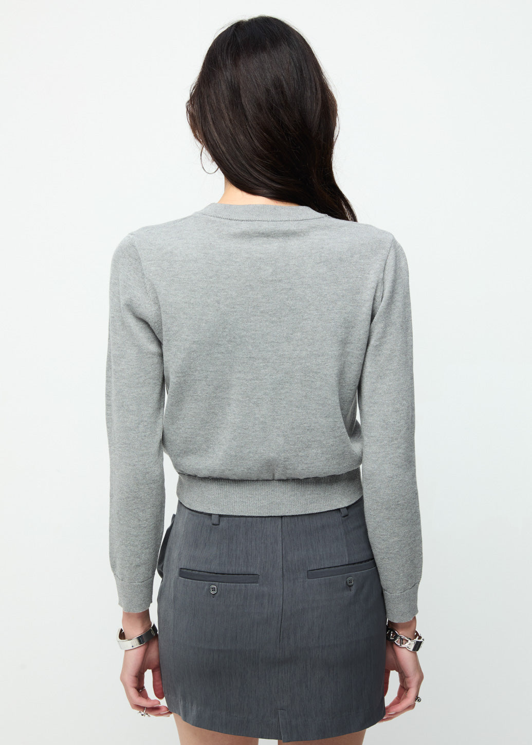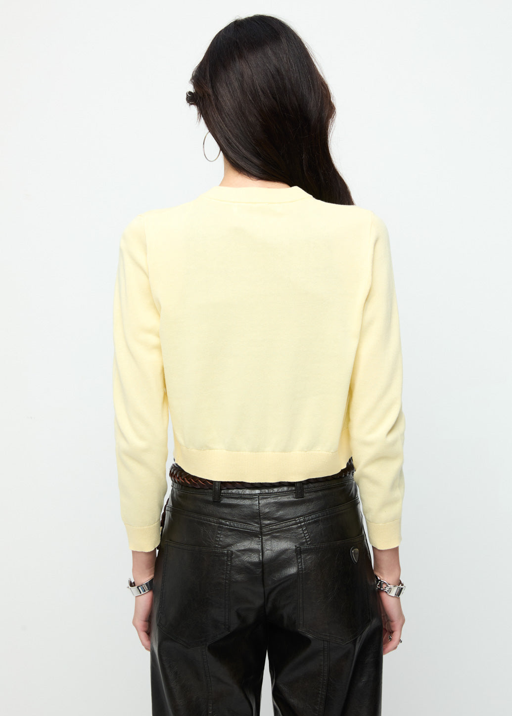 A cropped knitted cardigan with a modern edge, highlighted by a tonal guitar pick logo on the chest. Finished with ribbed detailing along the neckline, cuffs, and hem to define the silhouette of a chic yet minimal aesthetic. Perfect for mixing and matching with soft-toned items to get into feminine looks.