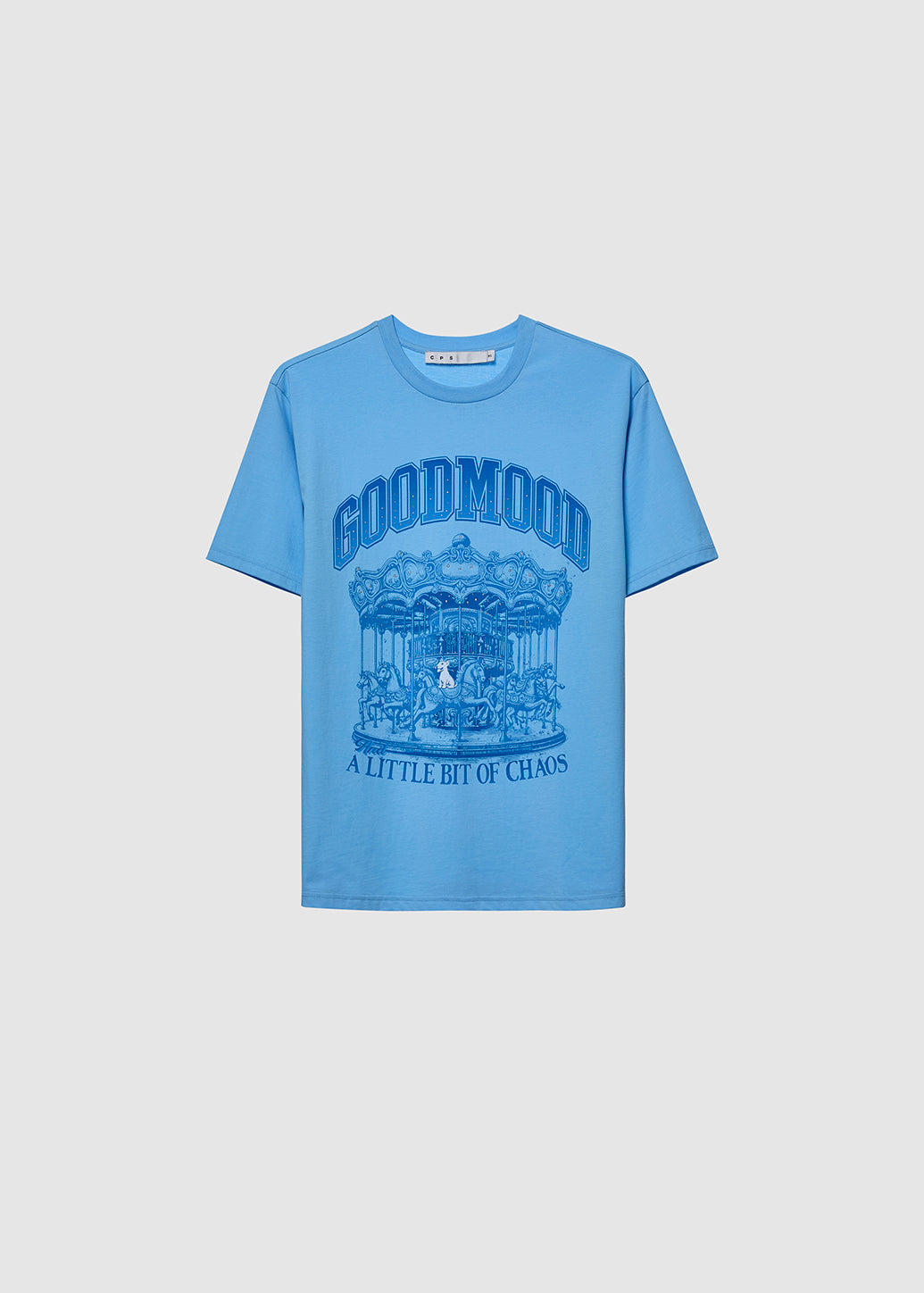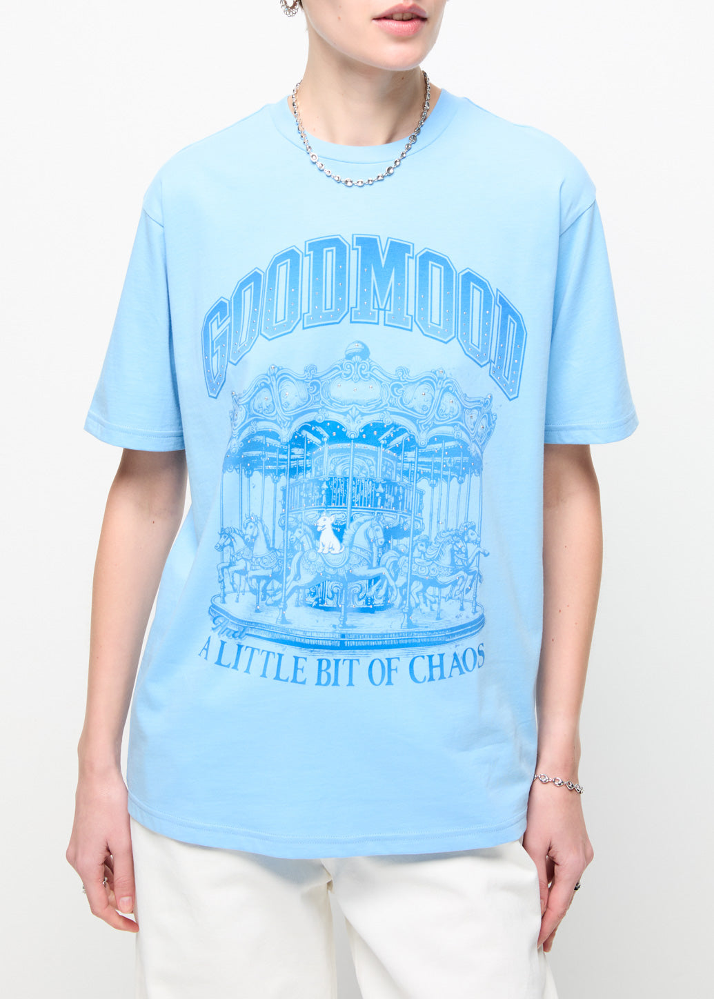 Celebrate the Year of the Horse with a twist! This graphic tee features a classic merry-go-round carousel, but look closer to find a mischievous white dog hiding among the horses. Paired with a cheeky slogan, this shirt is designed for those who love a blend of vintage aesthetic and playful humor.