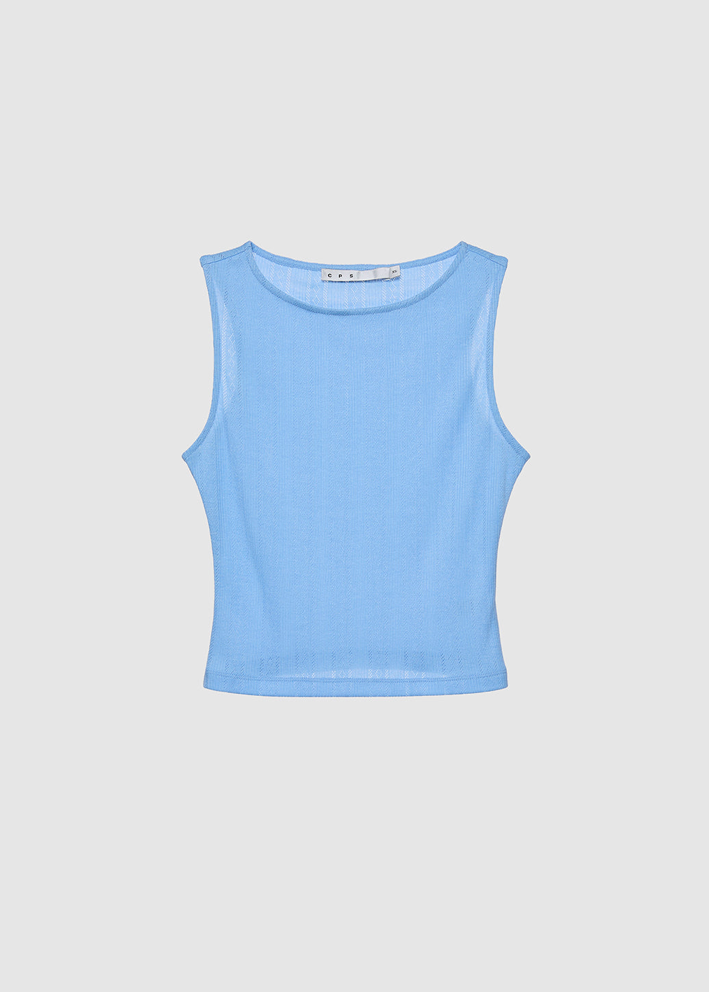 A feminine, fitted tank top in a refreshing summer blue hue. This essential piece features a subtle yet unique textured fabric that adds sophisticated depth to its simple, form-fitting silhouette.