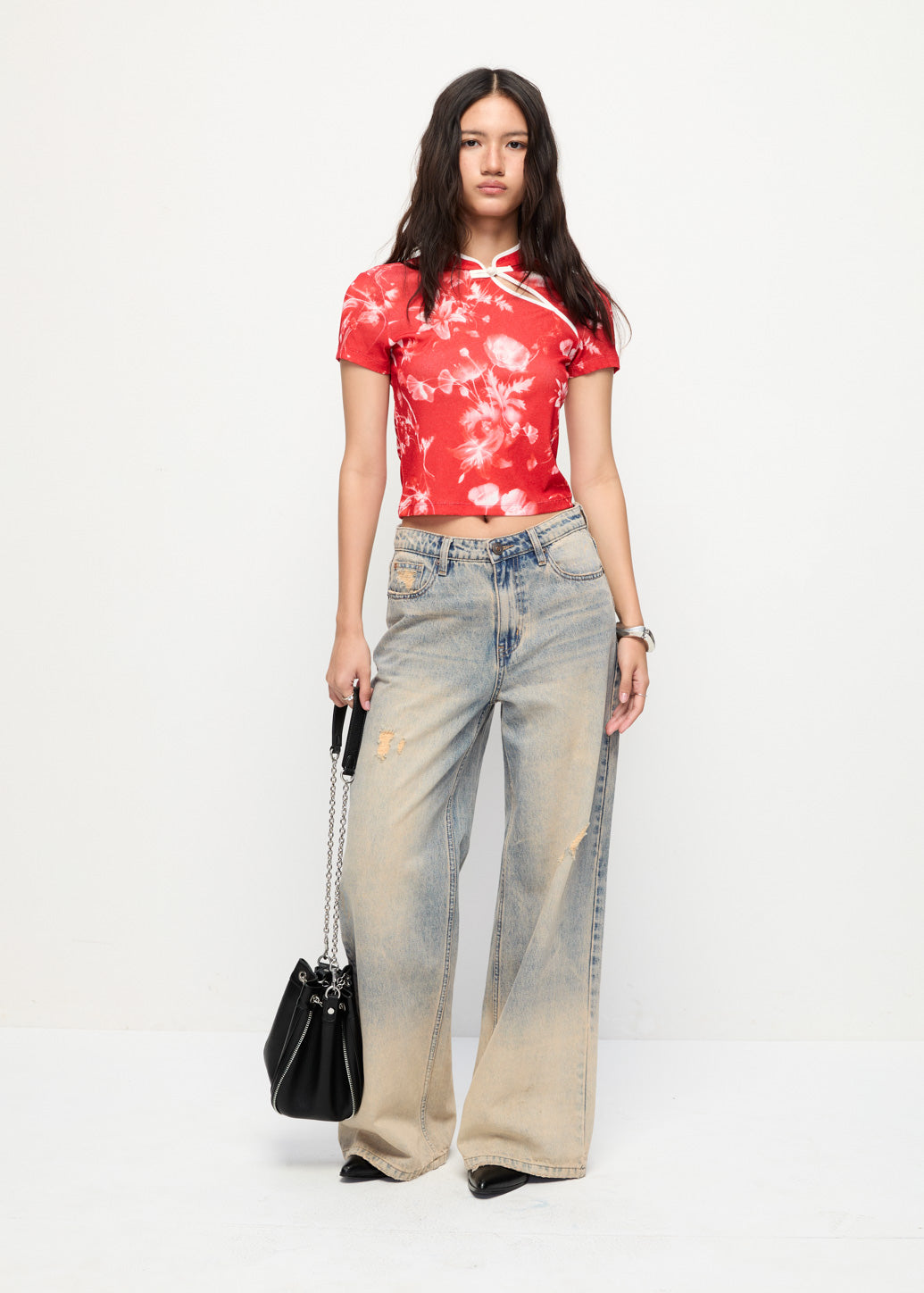 This vibrant red top reimagines traditional heritage through a mandarin collar and elegant Chinese knot buttons. The design is elevated by a white ginkgo flower print—a striking symbol of prosperity—serving as a perfect statement piece that blends cultural roots with modern festive fashion