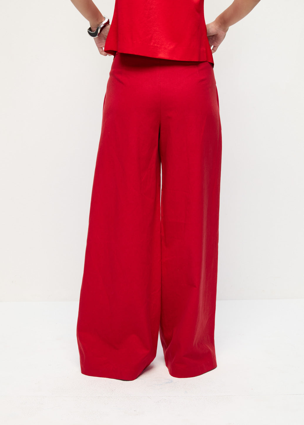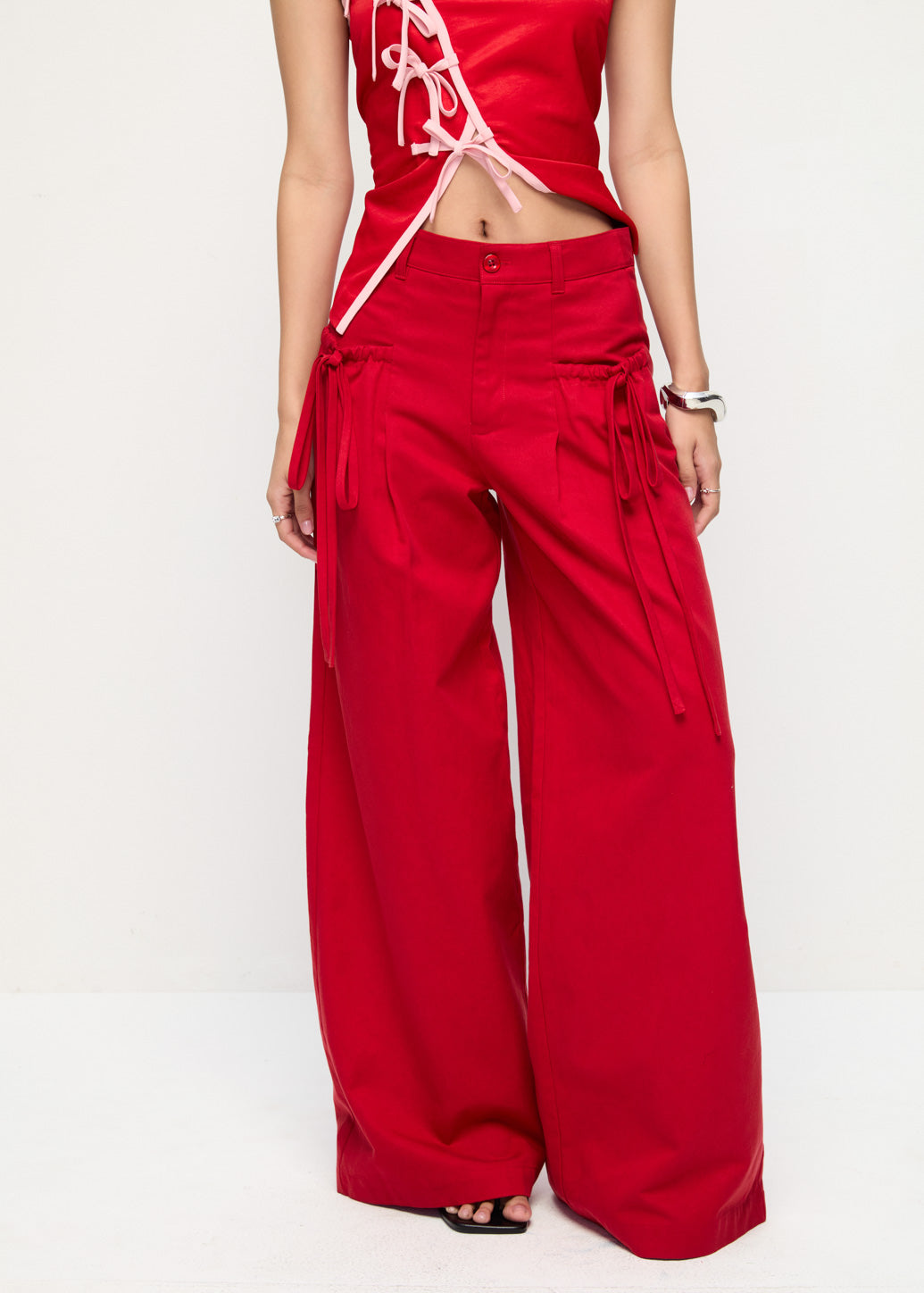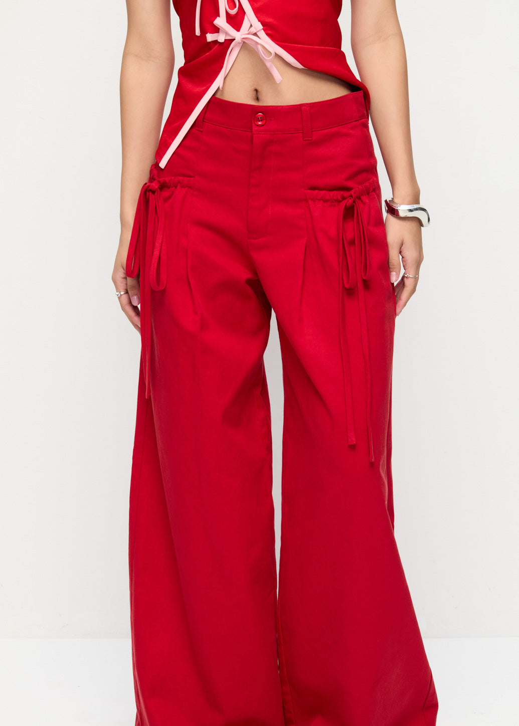 These red wide-leg pants feature charming bow-tie pocket details, thoughtfully designed to coordinate with our matching sleeveless top. The fluid silhouette adds a modern and feminine touch to your Chinese New Year look, making it a versatile staple suitable for any occasion.