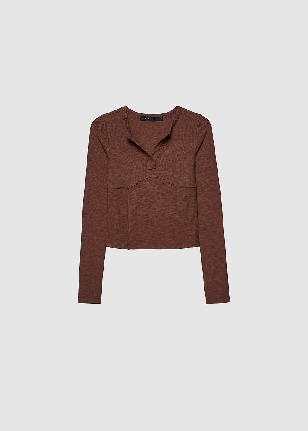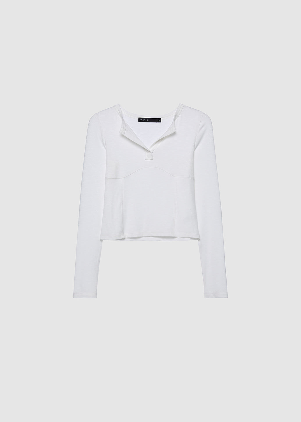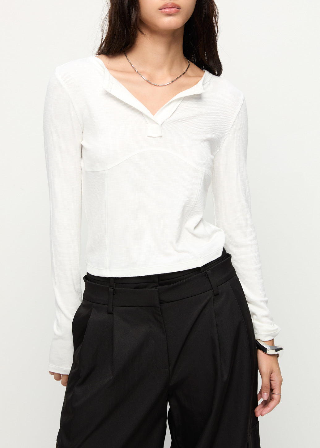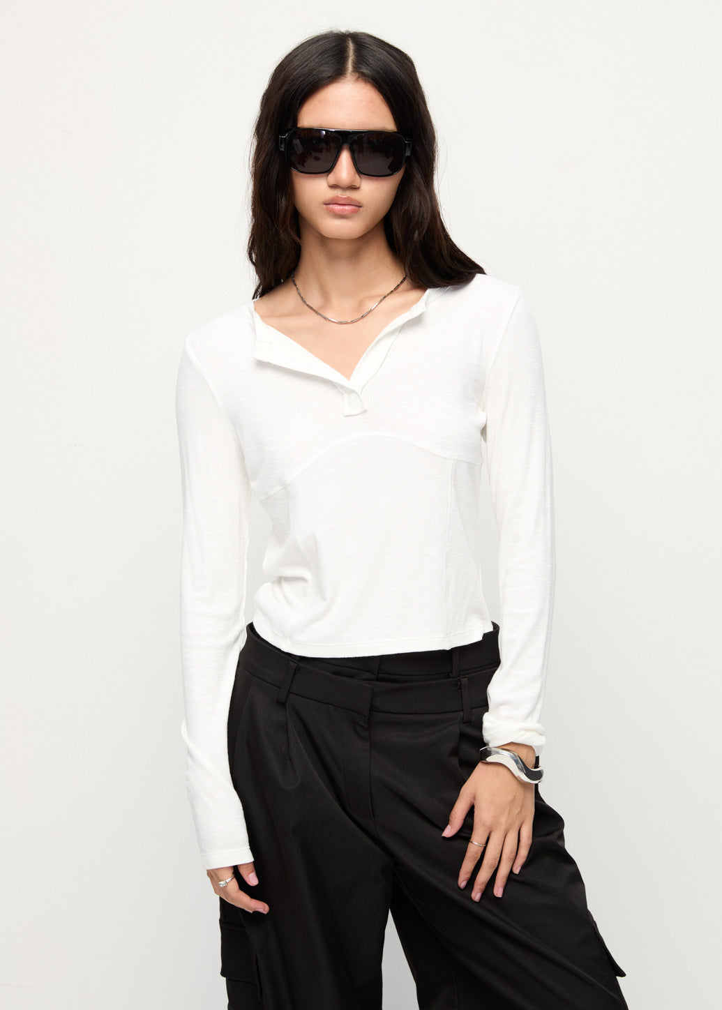 Designed with contouring seam details, this regular-fit long-sleeve top subtly enhances the silhouette. The half-button closure balances structure and softness, offering a refined yet effortless look. This piece is easy to style with denim for a modern feminine aesthetic.