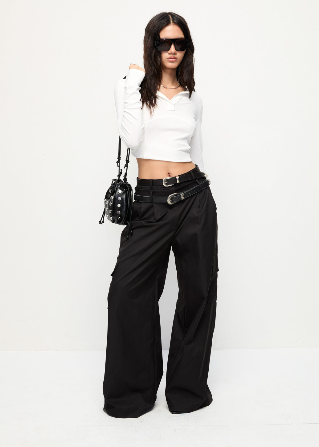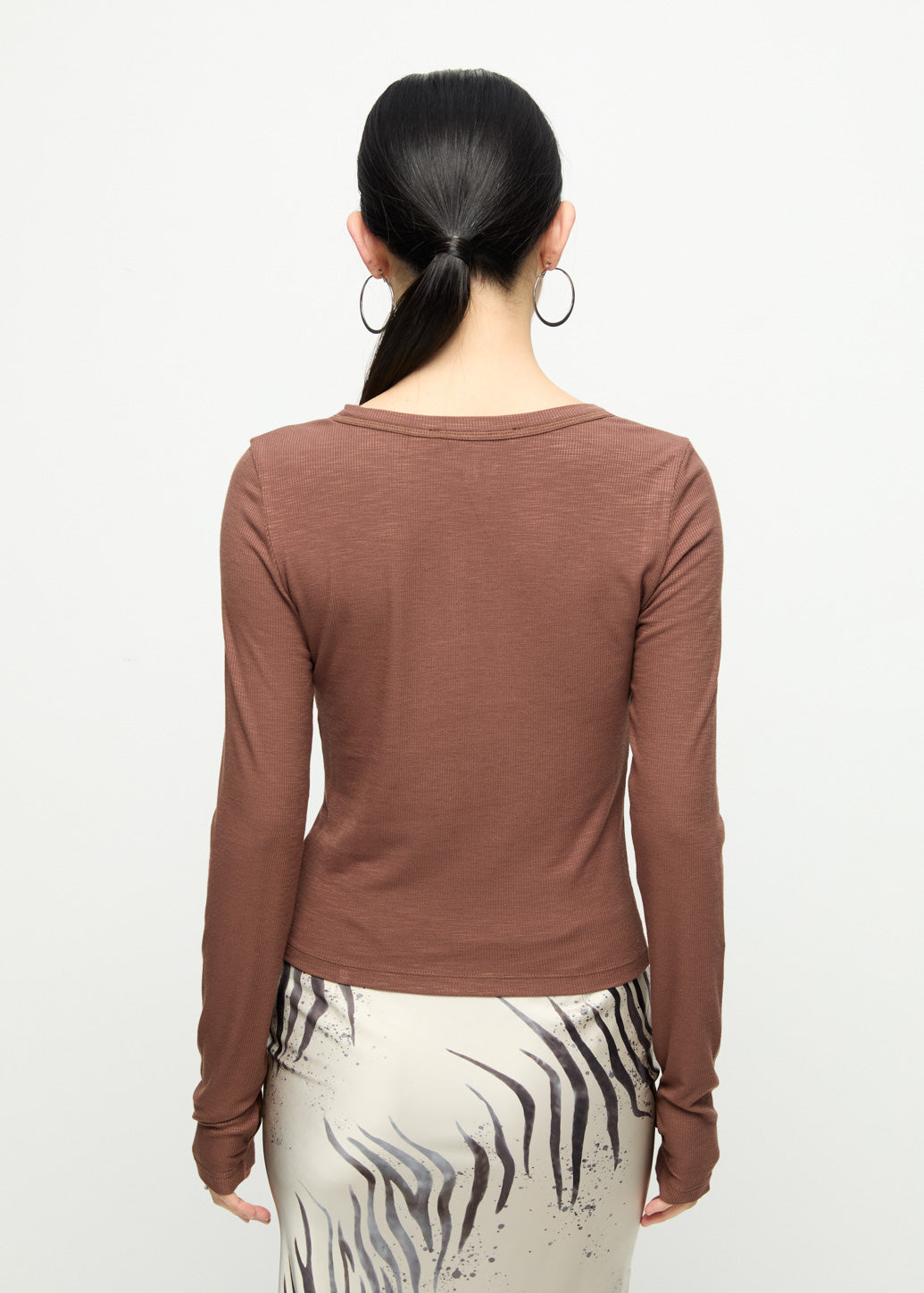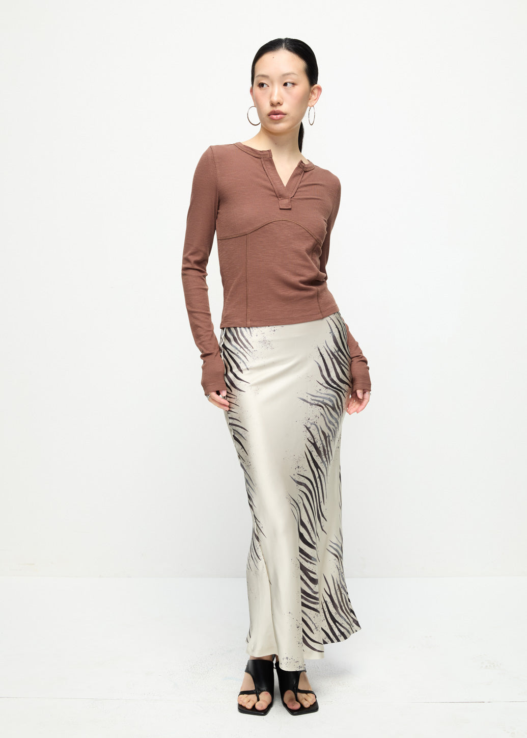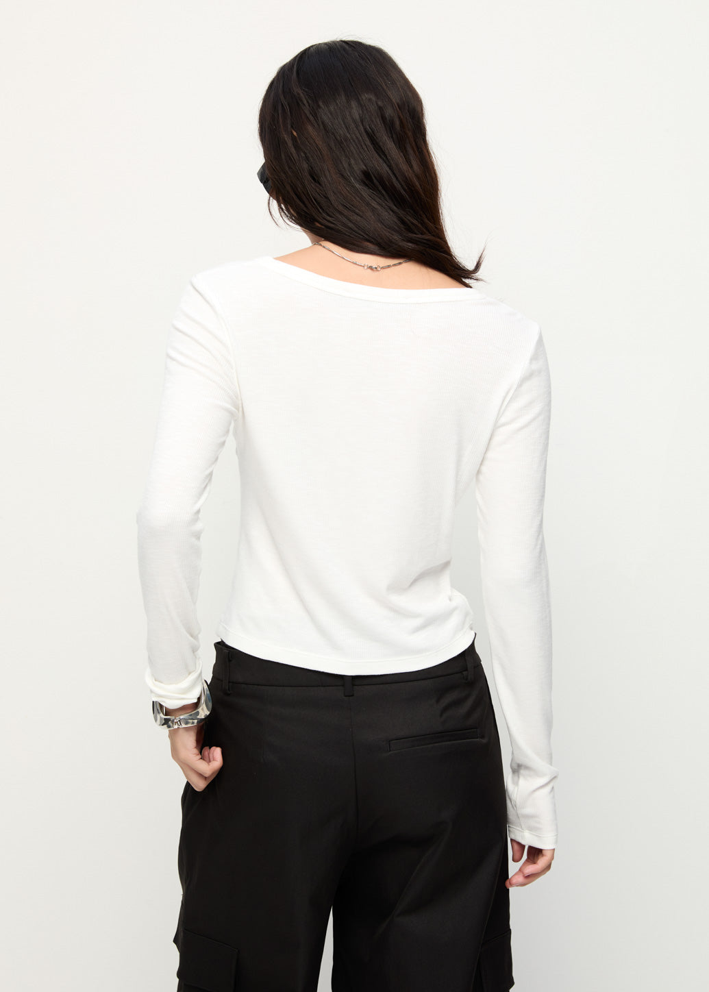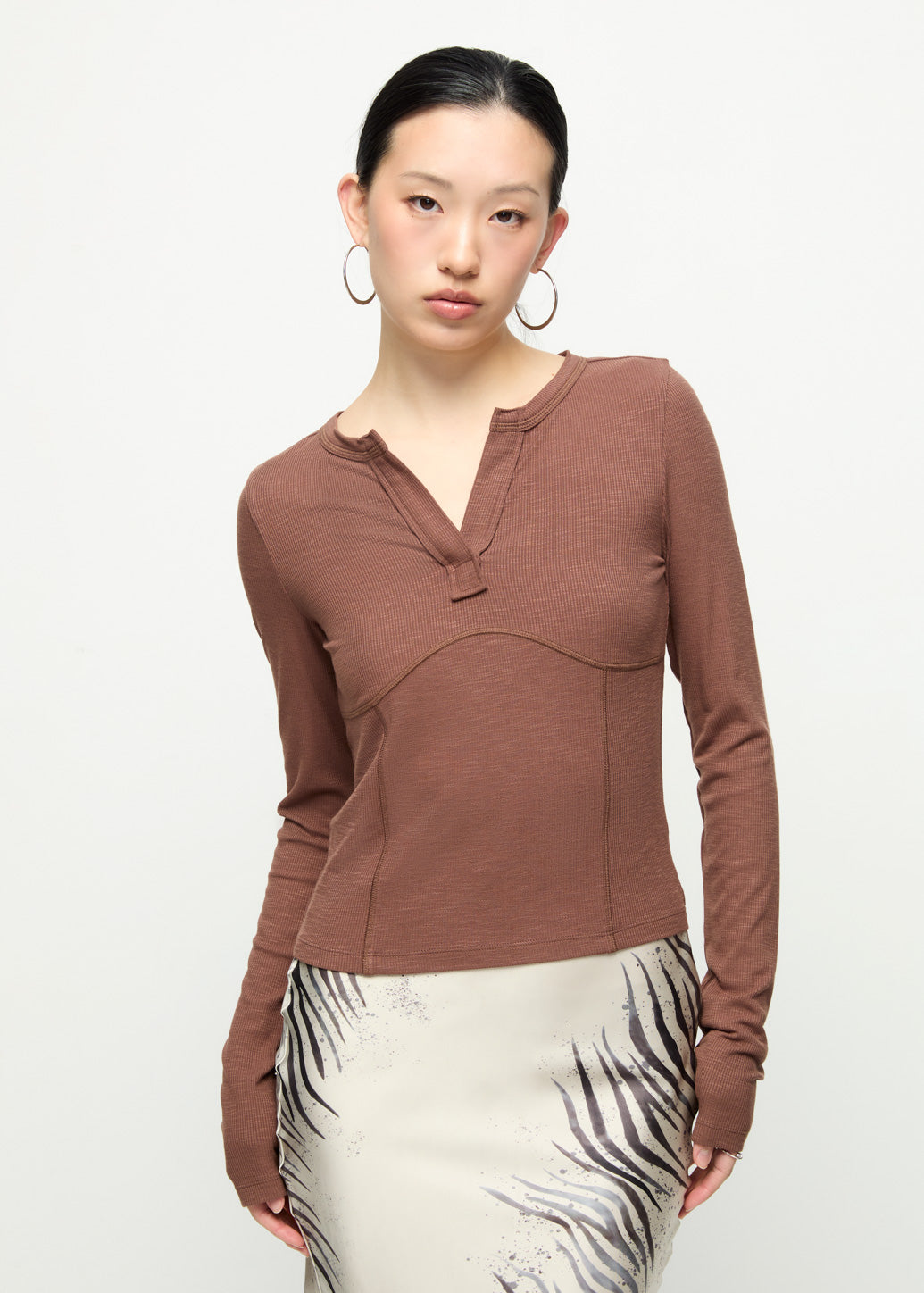 Designed with contouring seam details, this regular-fit long-sleeve top subtly enhances the silhouette. The half-button closure balances structure and softness, offering a refined yet effortless look. This piece is easy to style with denim for a modern feminine aesthetic.