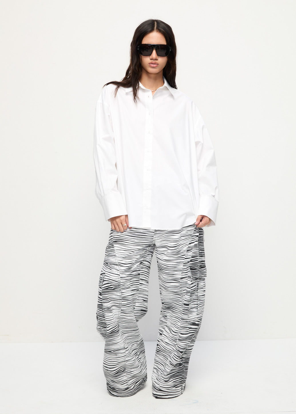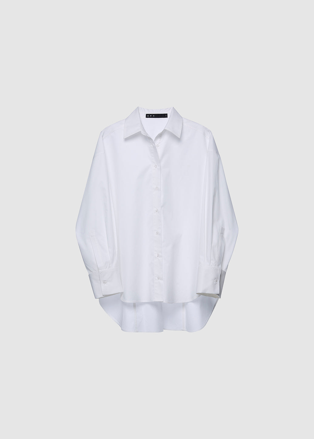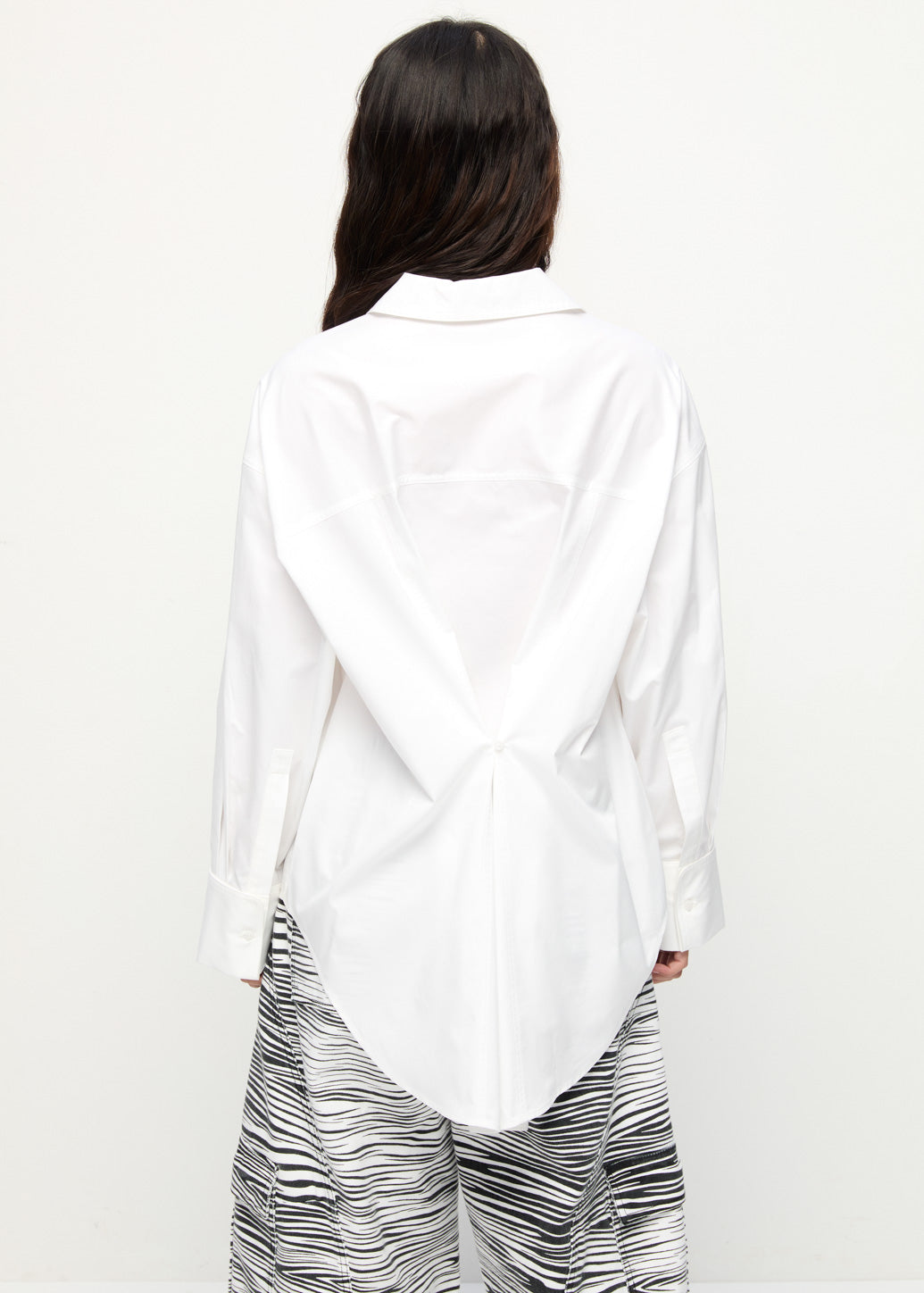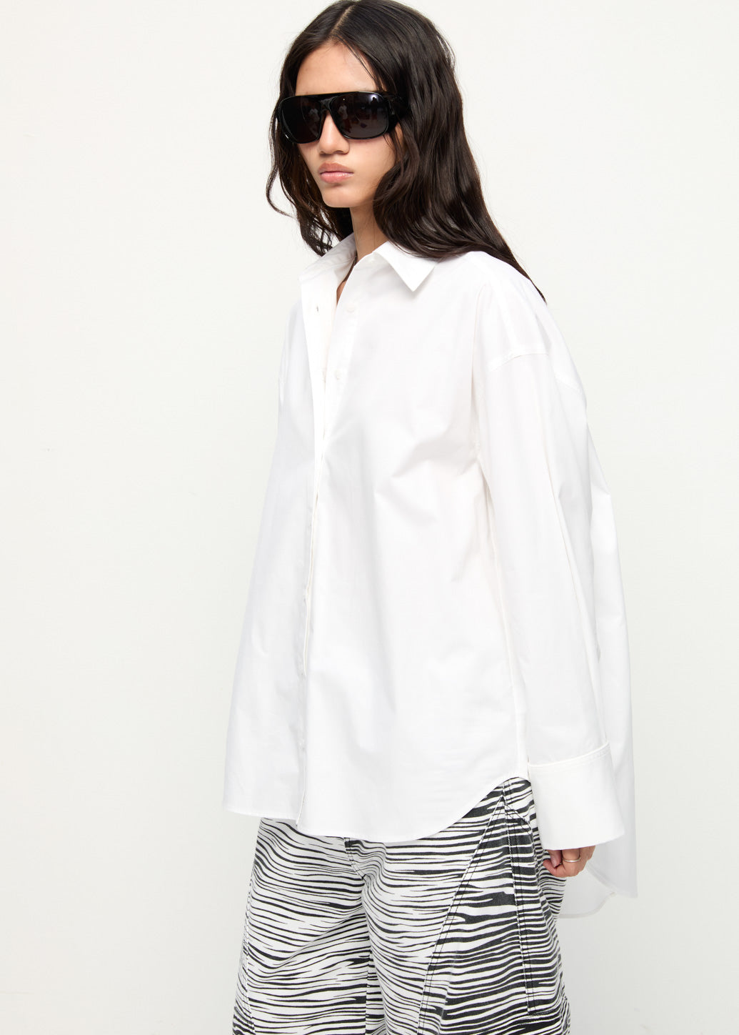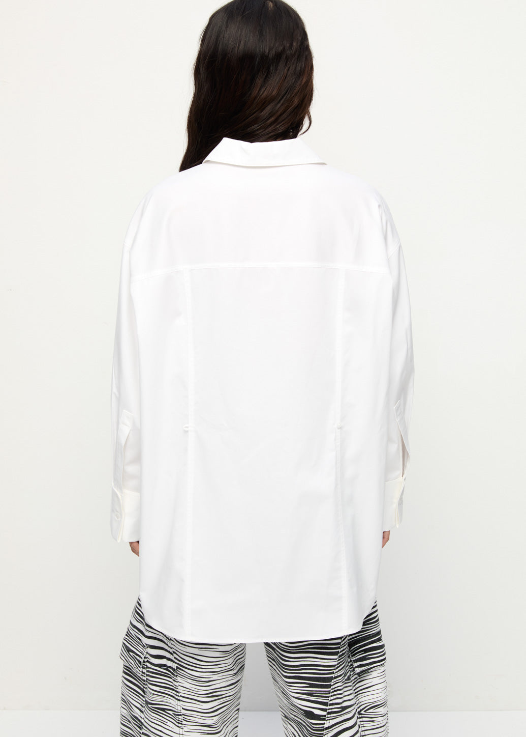 This oversized shirt is crafted from a soft Tencel and cotton blend, designed for comfort with a polished finish. The back button detail adds a refined touch, creating a relaxed yet considered silhouette that pairs effortlessly with jeans for a workwear-inspired, feminine look.