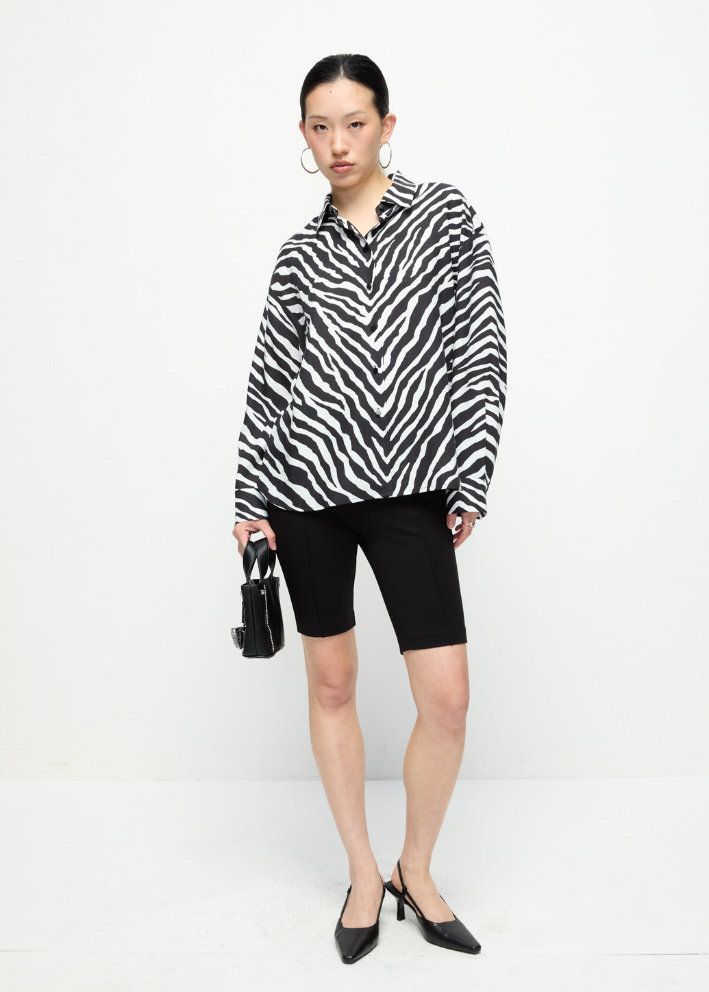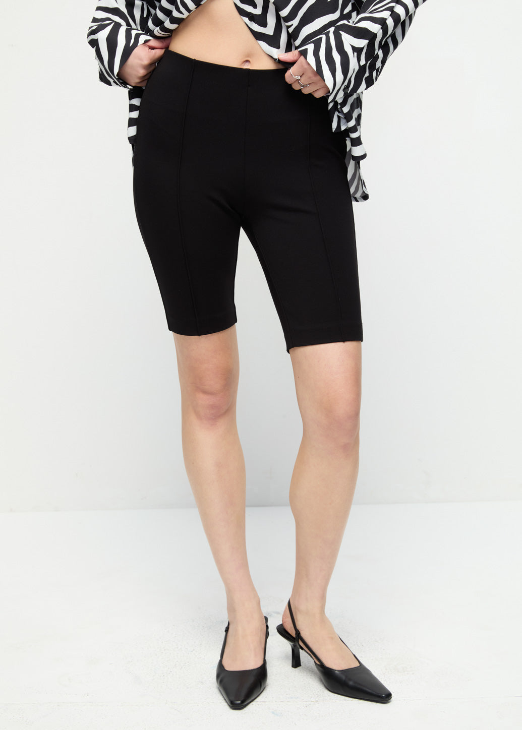 Knee-length shorts designed with a clean front seam detail for a refined, structured appearance. The relaxed silhouette offers comfort and versatility. This piece works with animal print tops to keep the focus on the detailing.