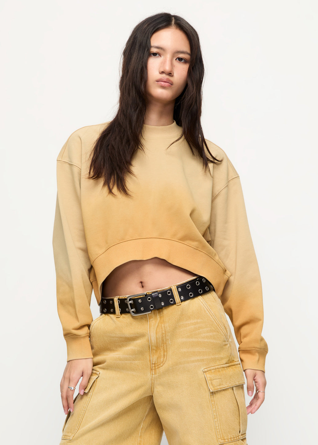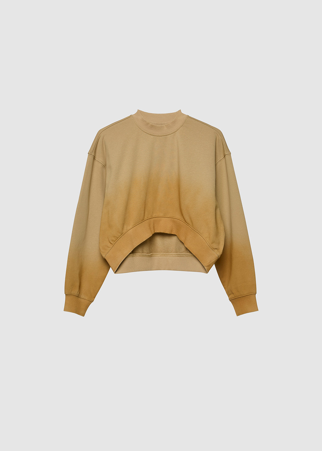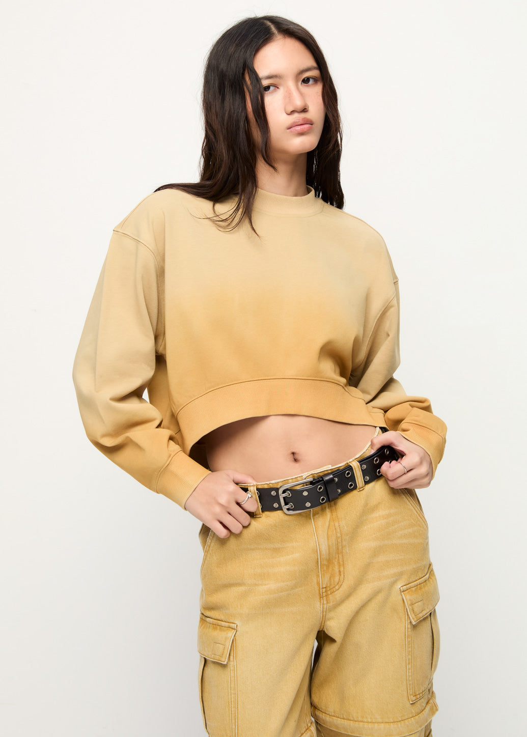 A cropped pullover swater crafted from cotton, finished with ribbed detailing at the cuffs, collar, and hem. The relaxed proportions and cozy texture works well on its own or layered for a modern, casual mood.