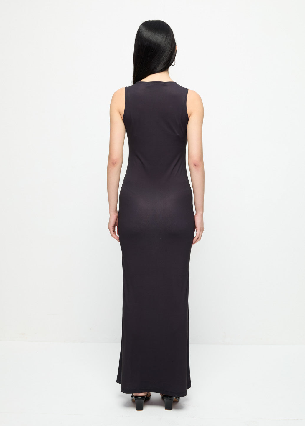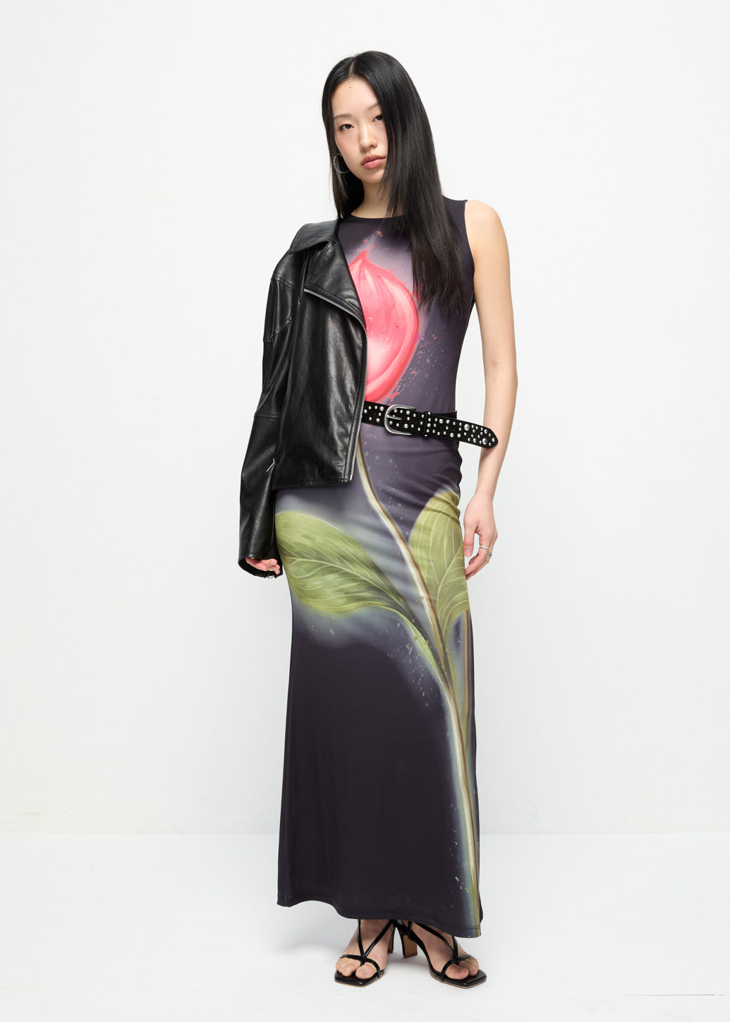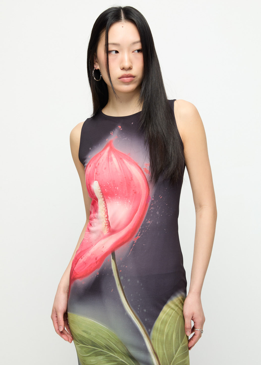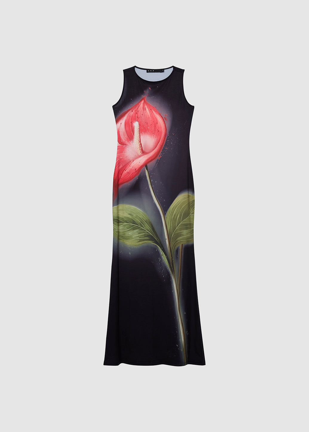 A sleeveless maxi dress designed with a flamingo flower graphic print for a bold yet romantic statement. The elongated silhouette creates effortless movement and can be easily layered with a jacket for versatile Valentine's or special event styling.