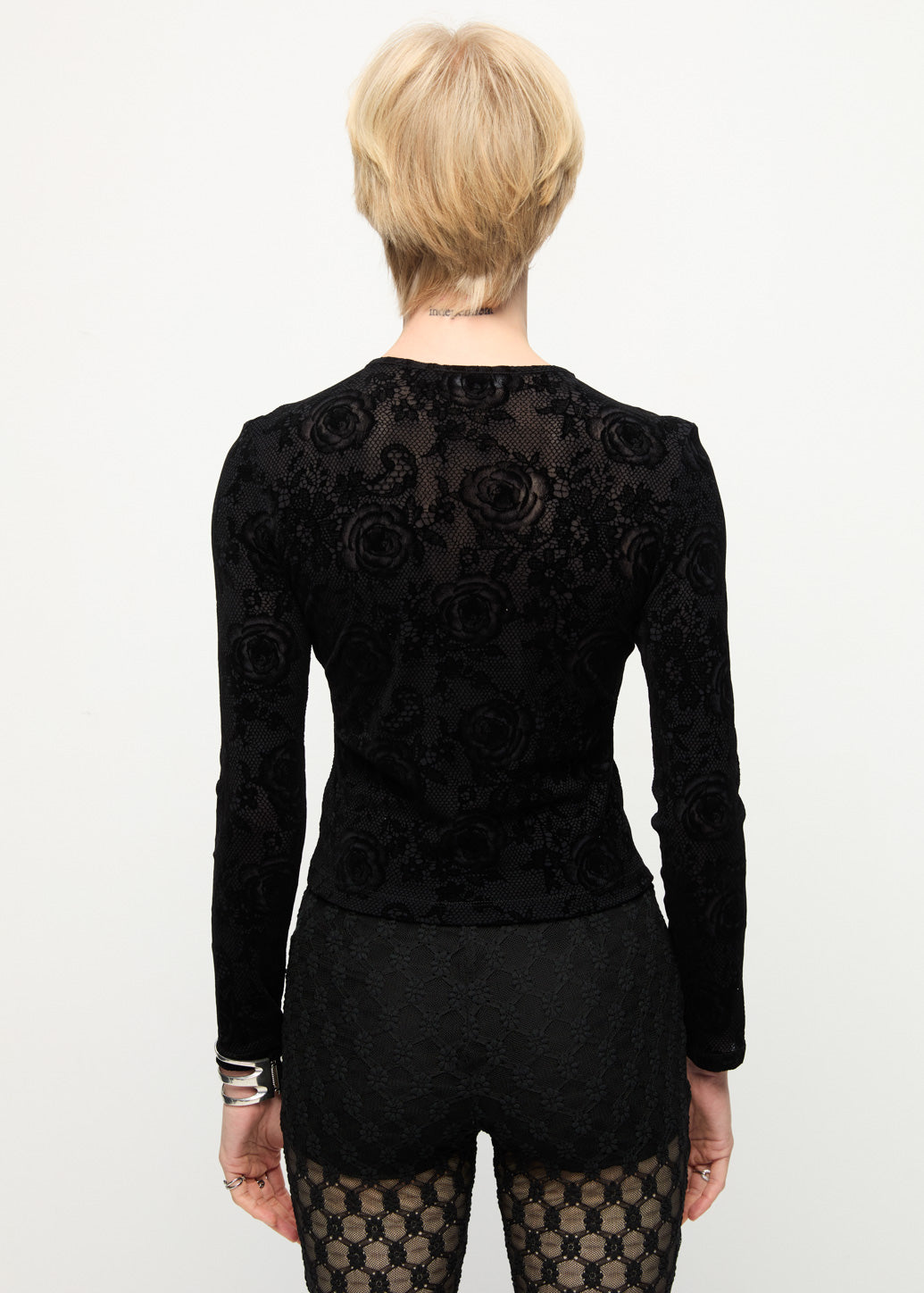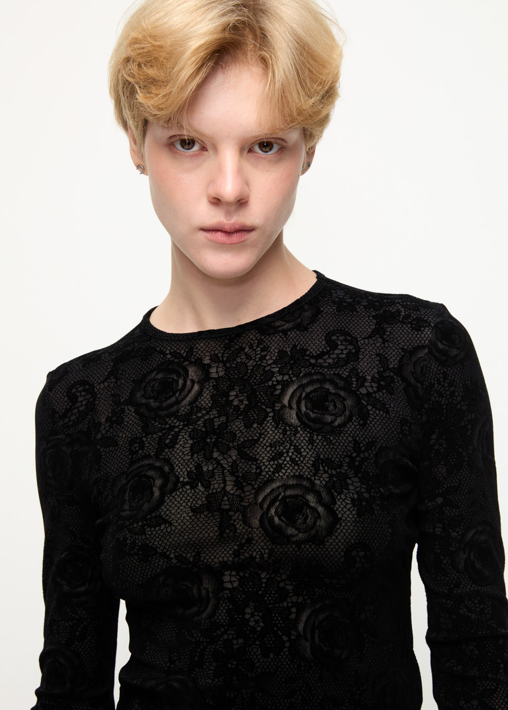 This long-sleeve top is crafted from a nylon and rayon blend, featuring a velvet print with contouring lace insert details. Designed to enhance the silhouette, this piece is easy to wear on its own or layered with other pieces for casual everyday styling.
