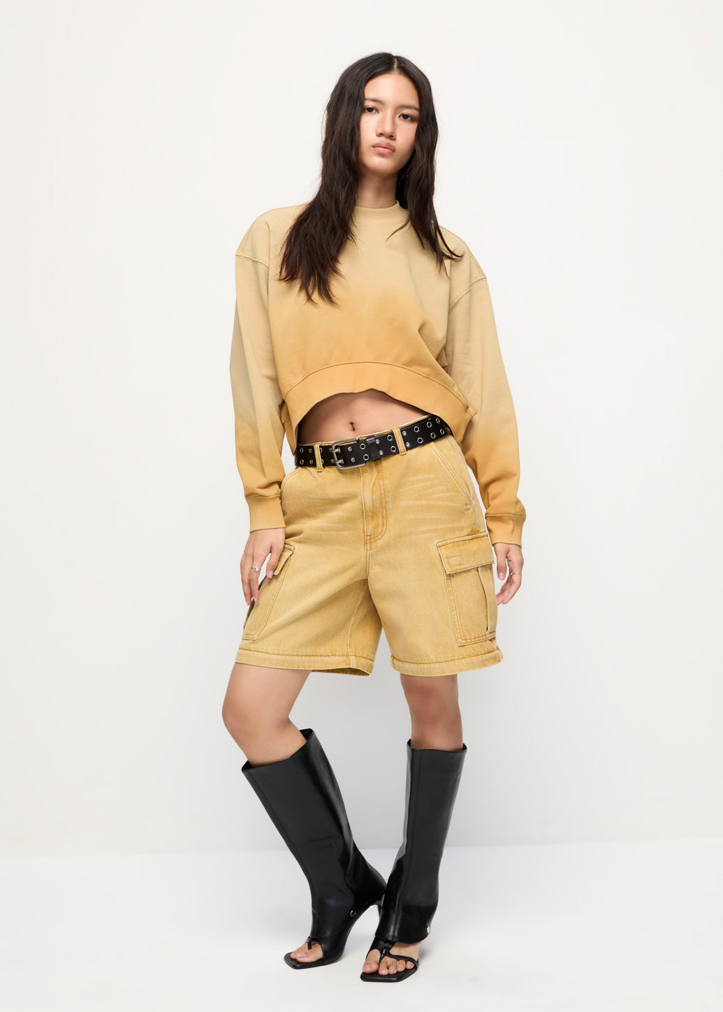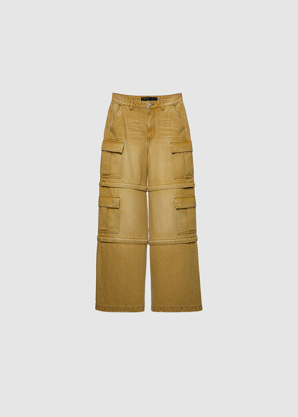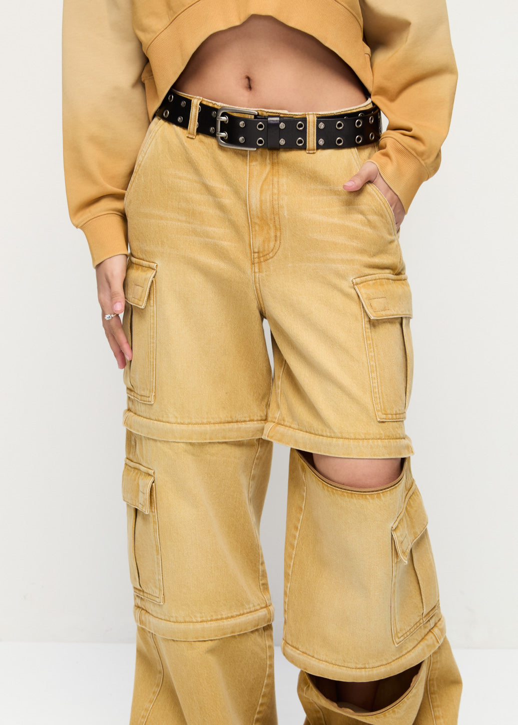 Wide-leg cargo jeans are crafted from cotton with a sand-washed finish for a soft, worn-in feel. Designed with functional cargo pockets and an adjustable belt strap, this piece combines utility details with modern, effortless style.