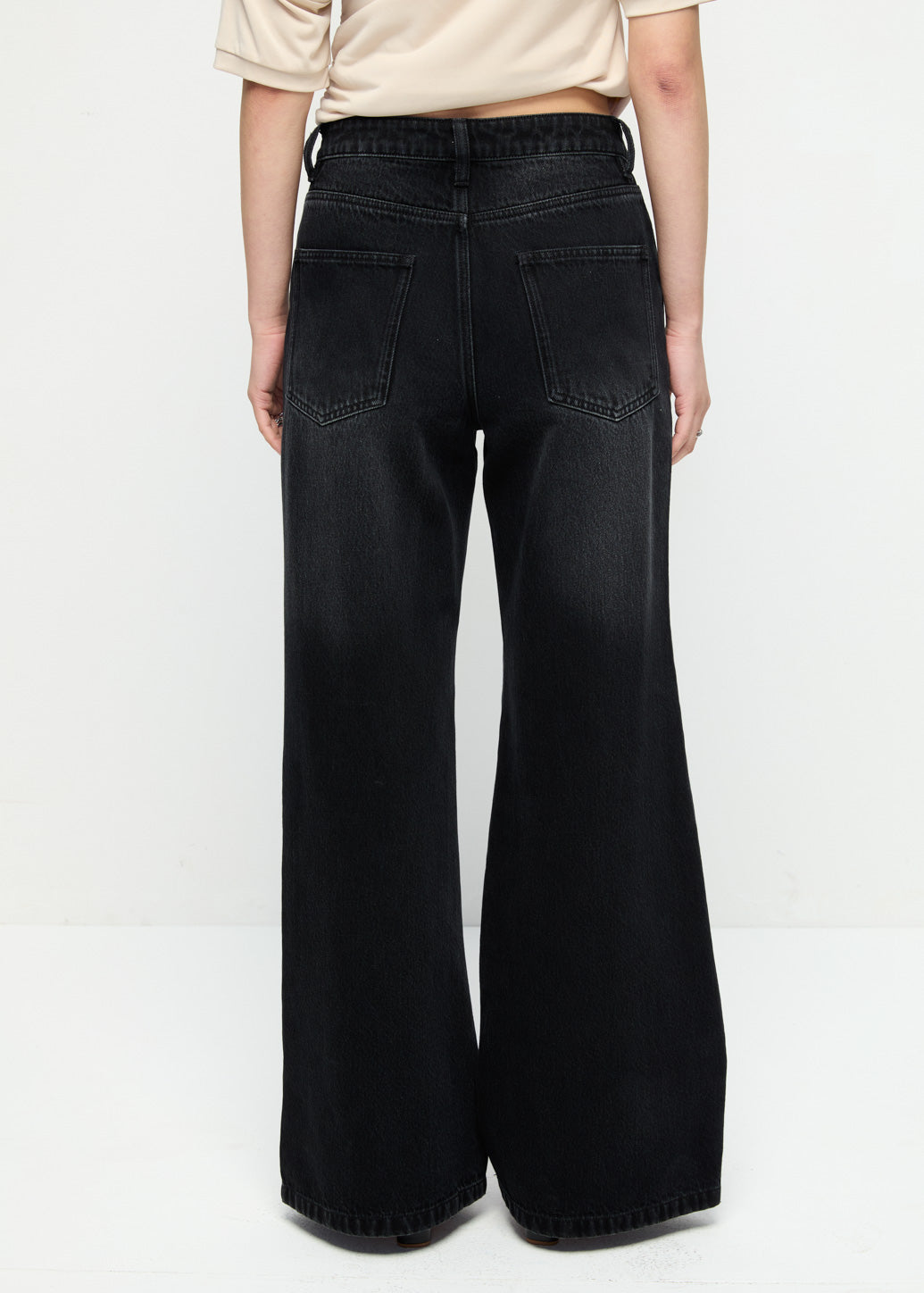 These flare-leg jeans are designed with lace insert cut-out detailing for a subtle statement. The slightly flared silhouette is finished with a zip-fly and button closure, blending classic denim structure with a modern, feminine edge.
