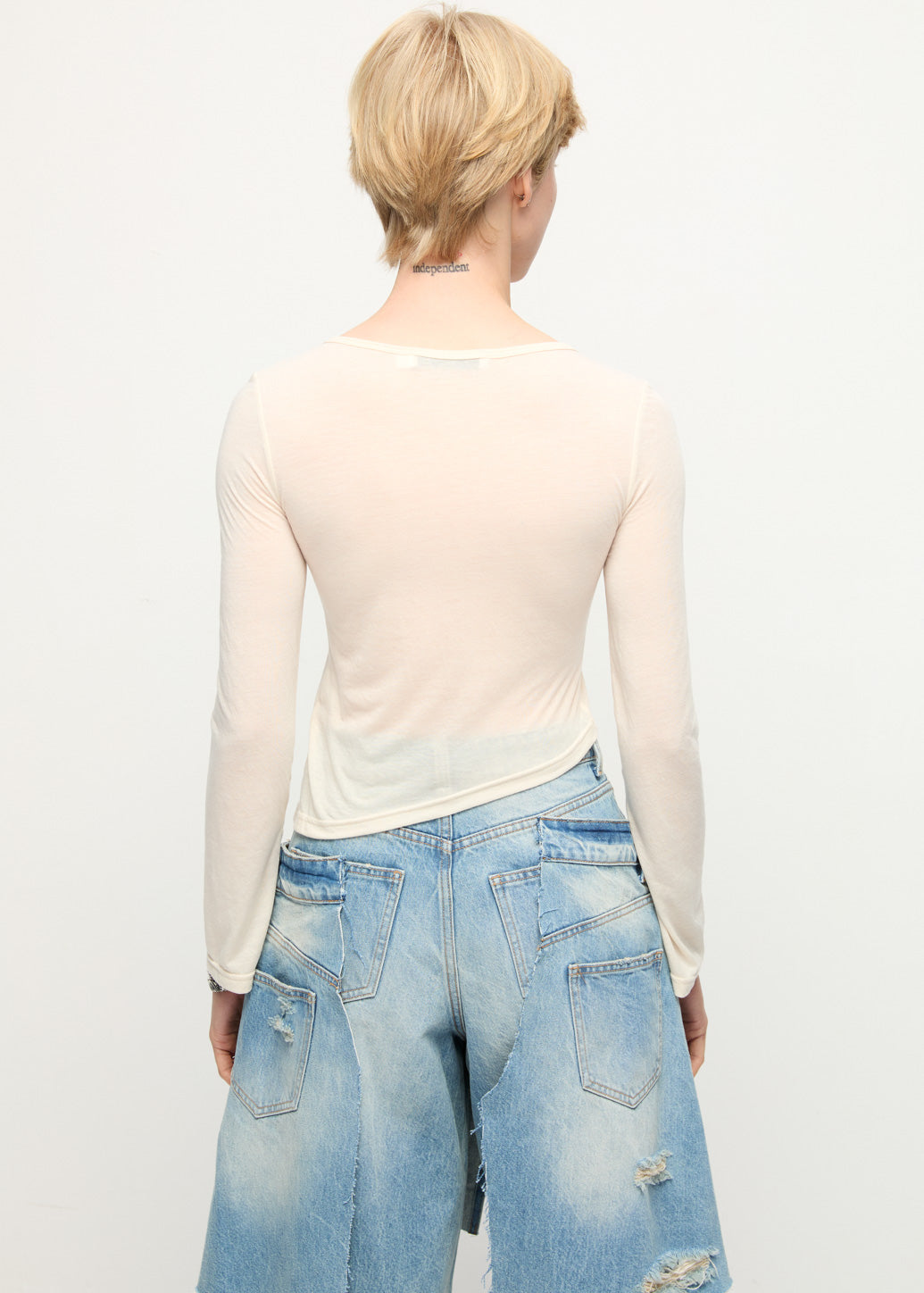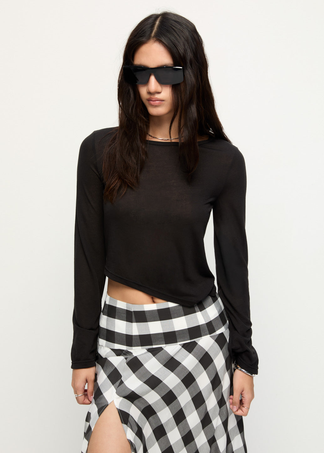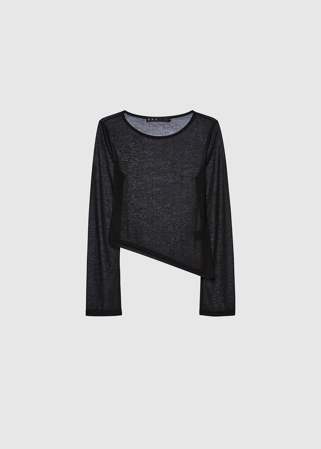 A regular-fit long sleeve top made from sheer polyester, designed with an asymmetric hem and underbust seam detail for added movement and visual interest. The clean lines and modern cut create a confident, understated statement for everyday wear.