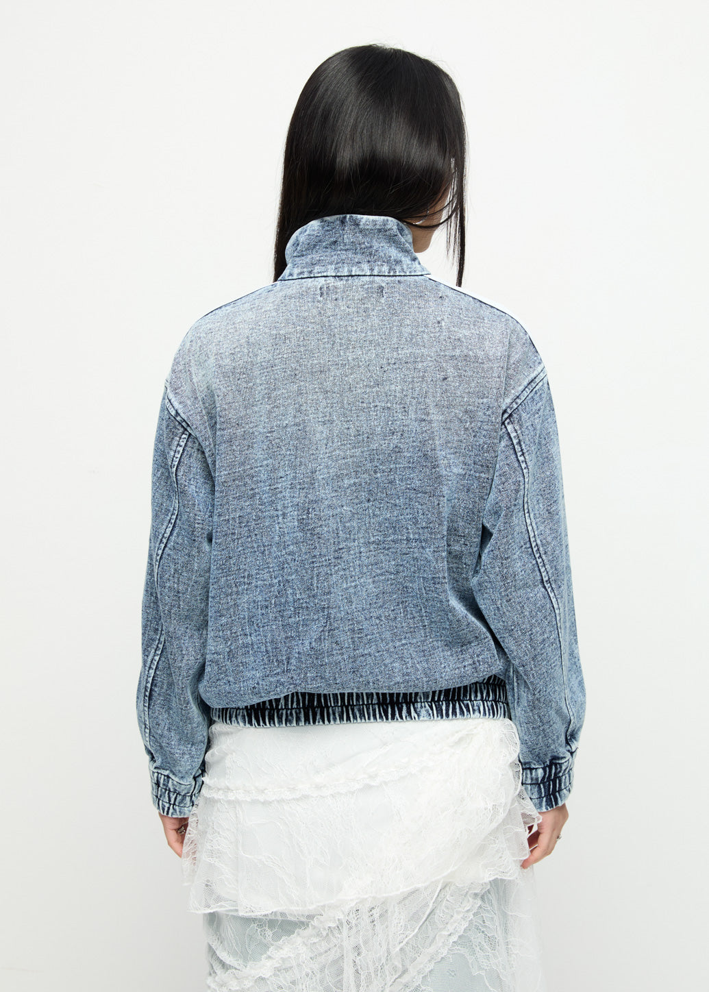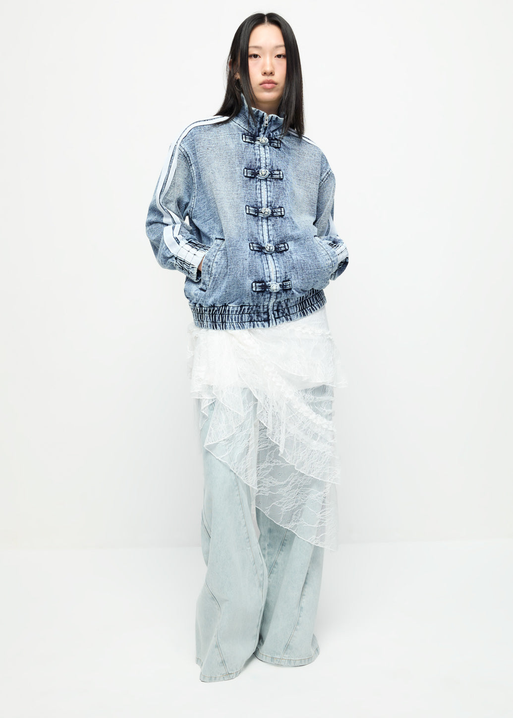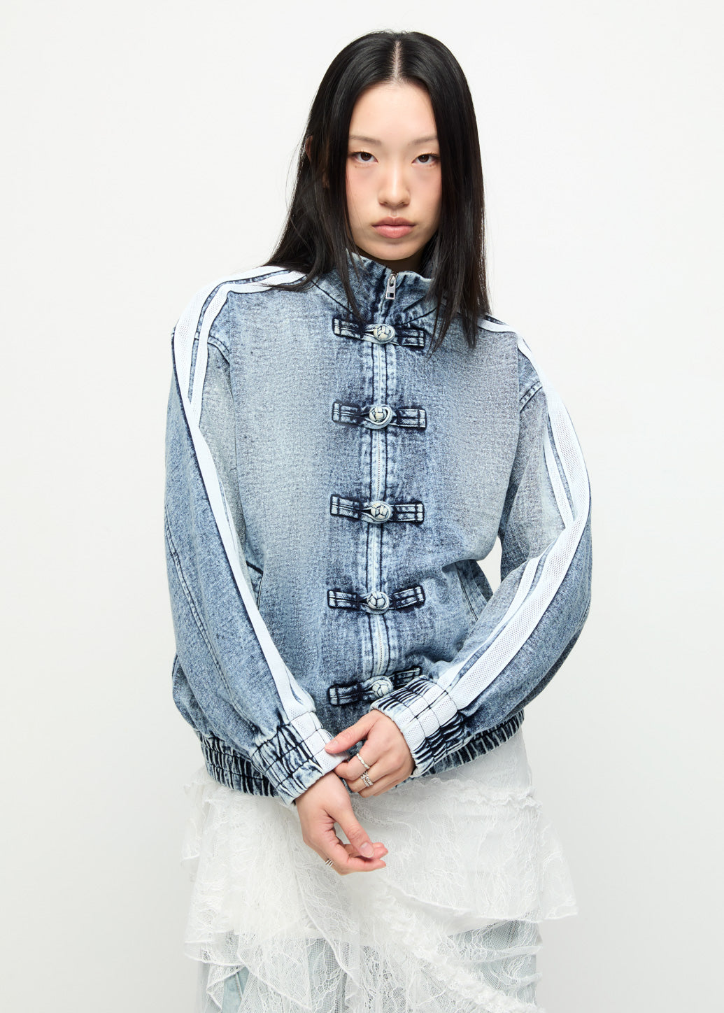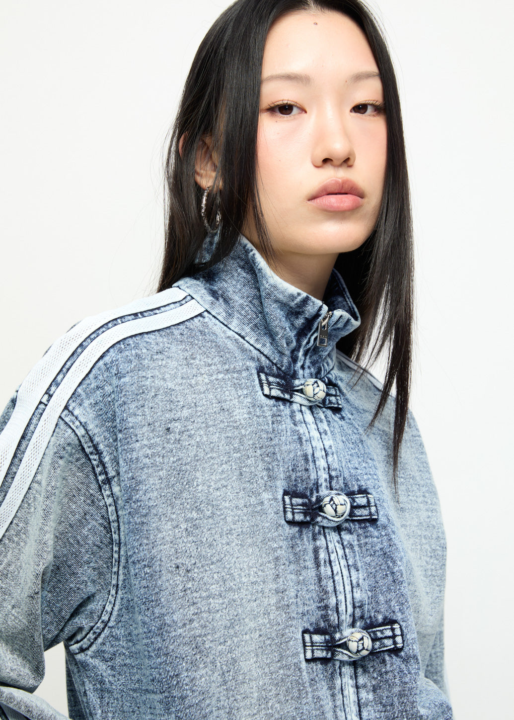 An oversized denim jacket piece designed with track-inspired detailing and a frog button closure. The high neck and relaxed structure offer a confident, contemporary layer for casual styling.