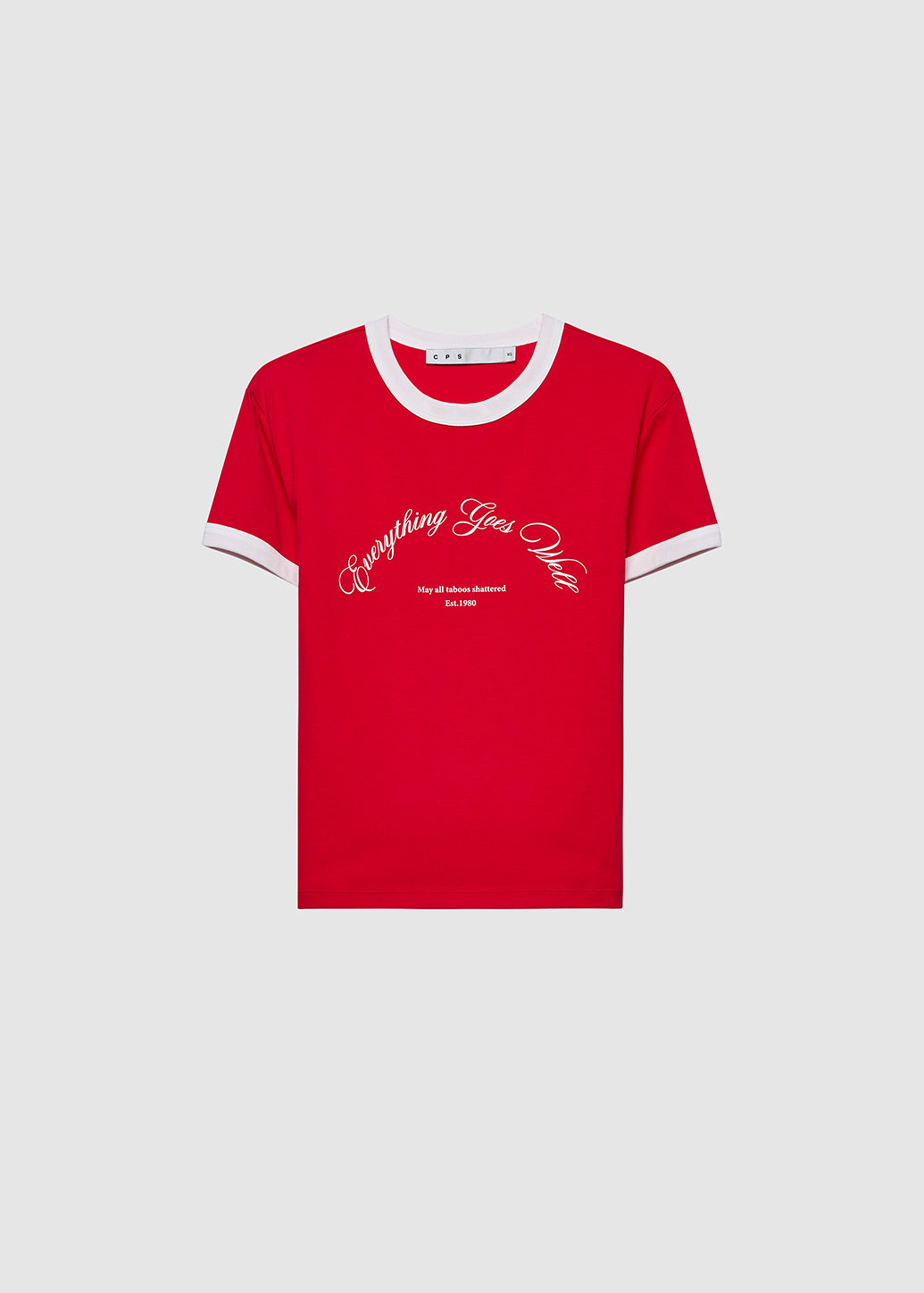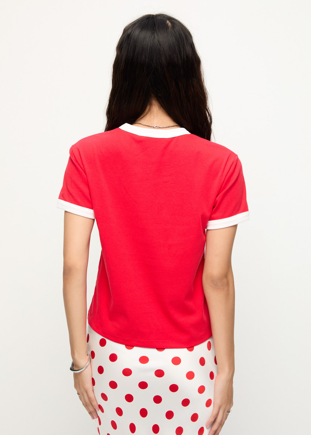 A short-sleeve T-shirt features is a round neckline and trim in a contrasting color. Designed with a front graphic print, the subtle detailing adds definition to a clean, modern everyday essential.