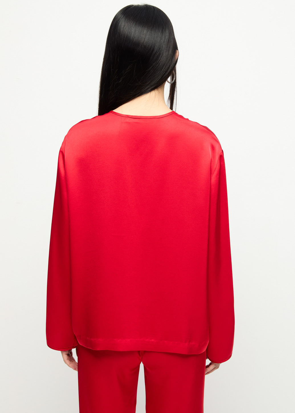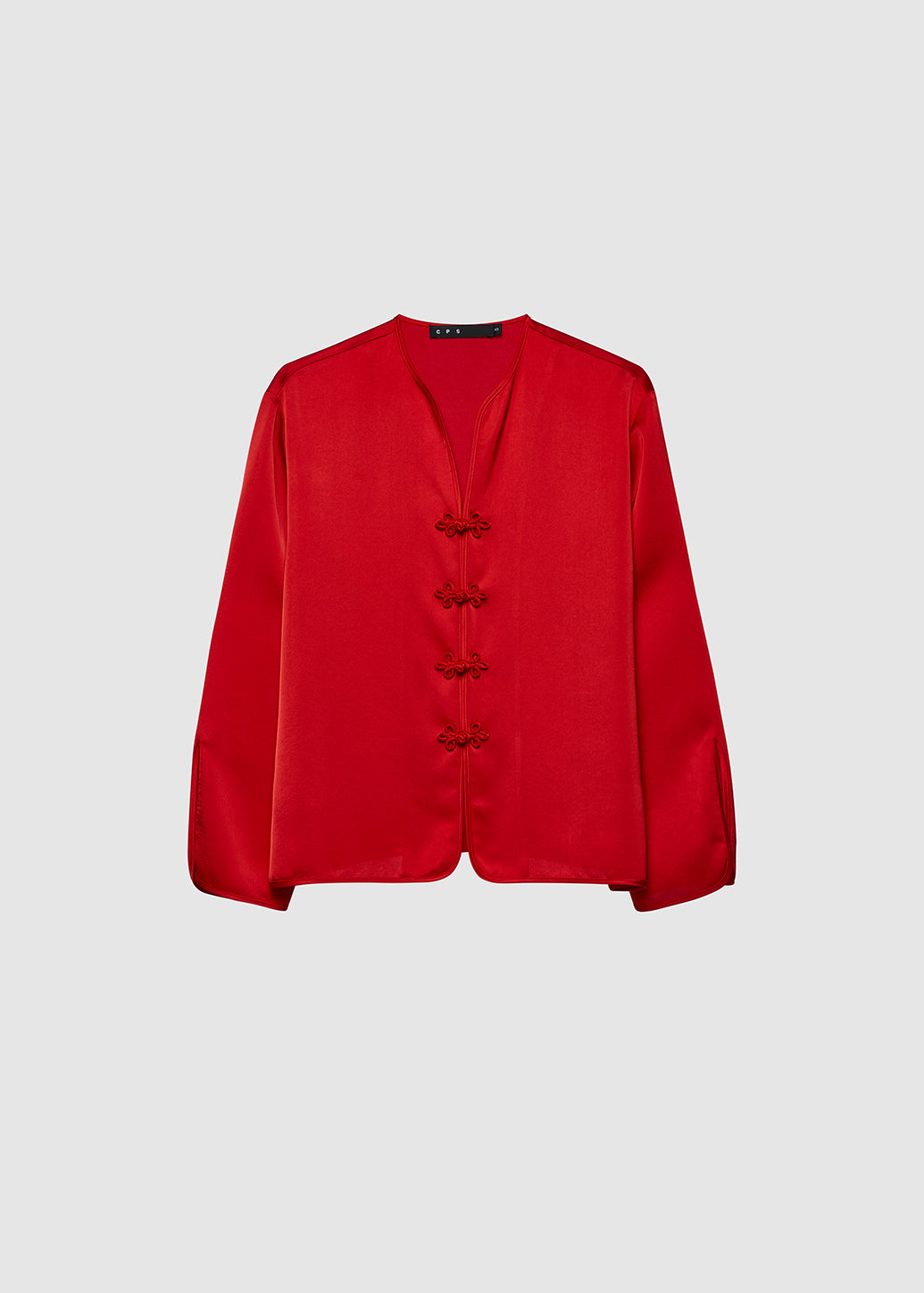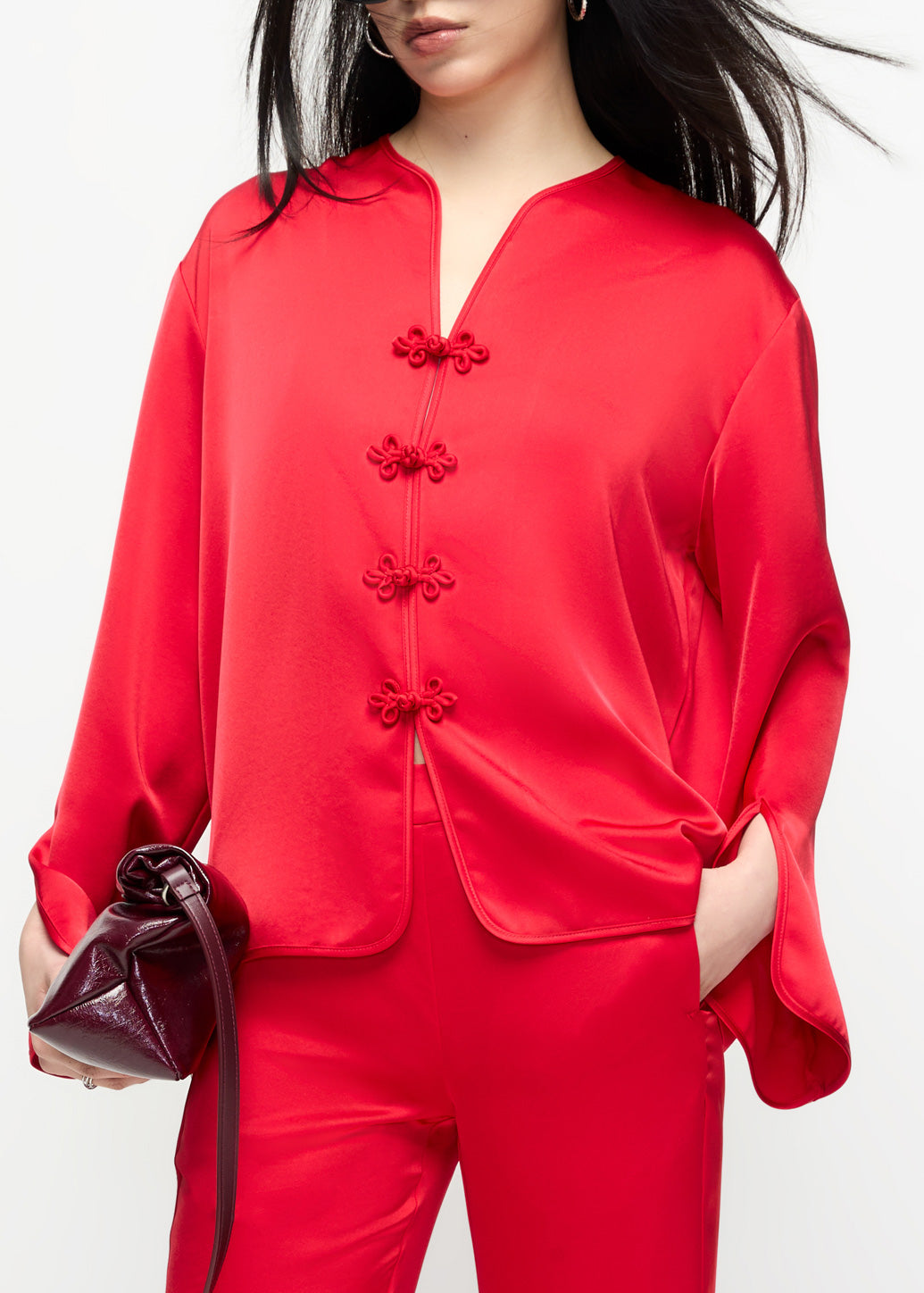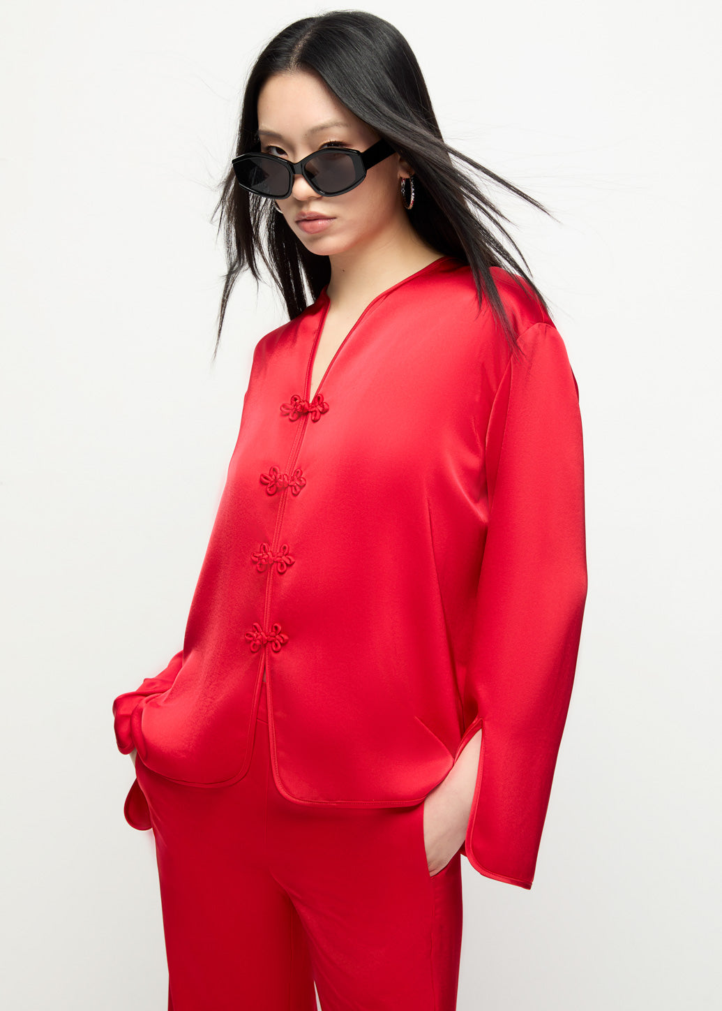 This vibrant red long-sleeve top features frog buttons for oriental inspred-look. The design is elevated by subtle flared cuffs, offering a perfect fusion of traditional Oriental elements and modern sartorial elegance.