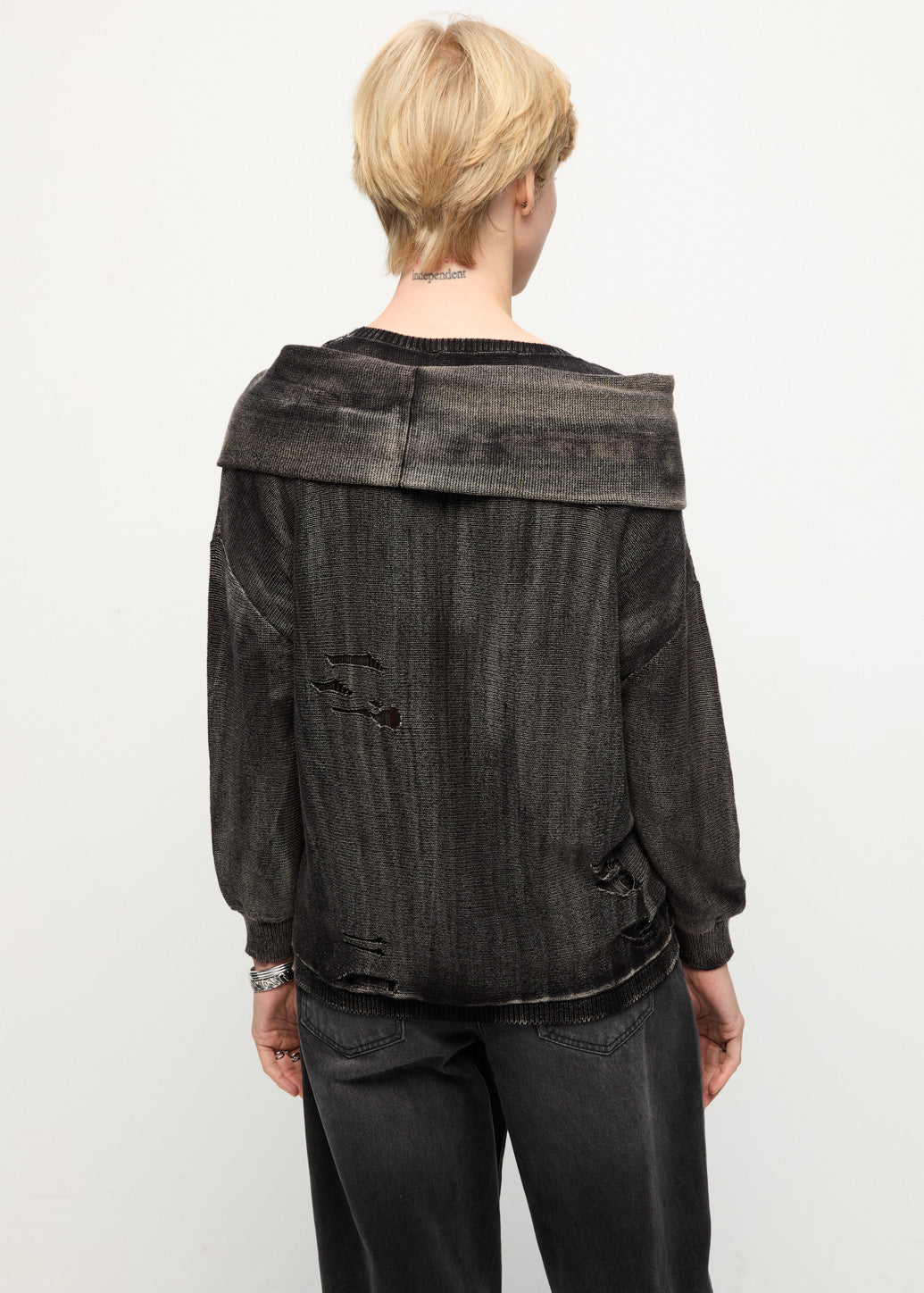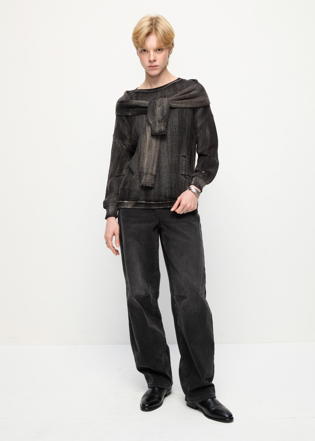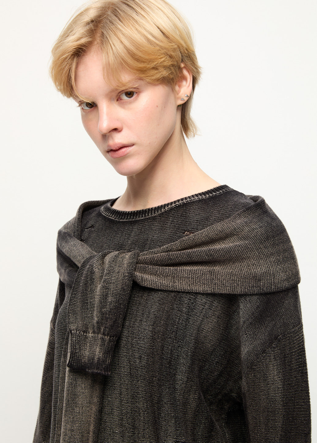 This oversized sweater features an attached top-sleeve detail layered over the body, designed to look like a sweater casually draped and tied around the shoulders. The relaxed silhouette keeps it comfortable, while the wrap-style sleeve detail adds dimension and a distinctive styling element.