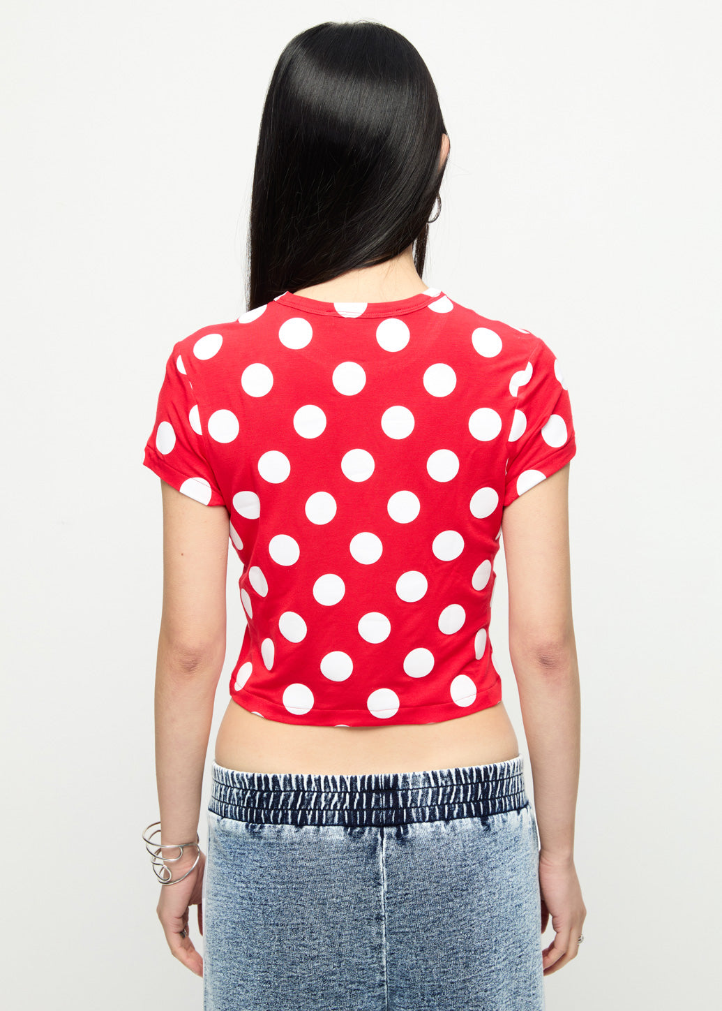 This graphic T-shirt is designed with a regular silhouette and a classic round neckline. It features detailed 'Love Addict' typography on the front, while an all-over polka dot pattern adds a festive charm inspired by Chinese New Year. This vibrant piece brings a unique character to seasonal looks while remaining effortless to wear.