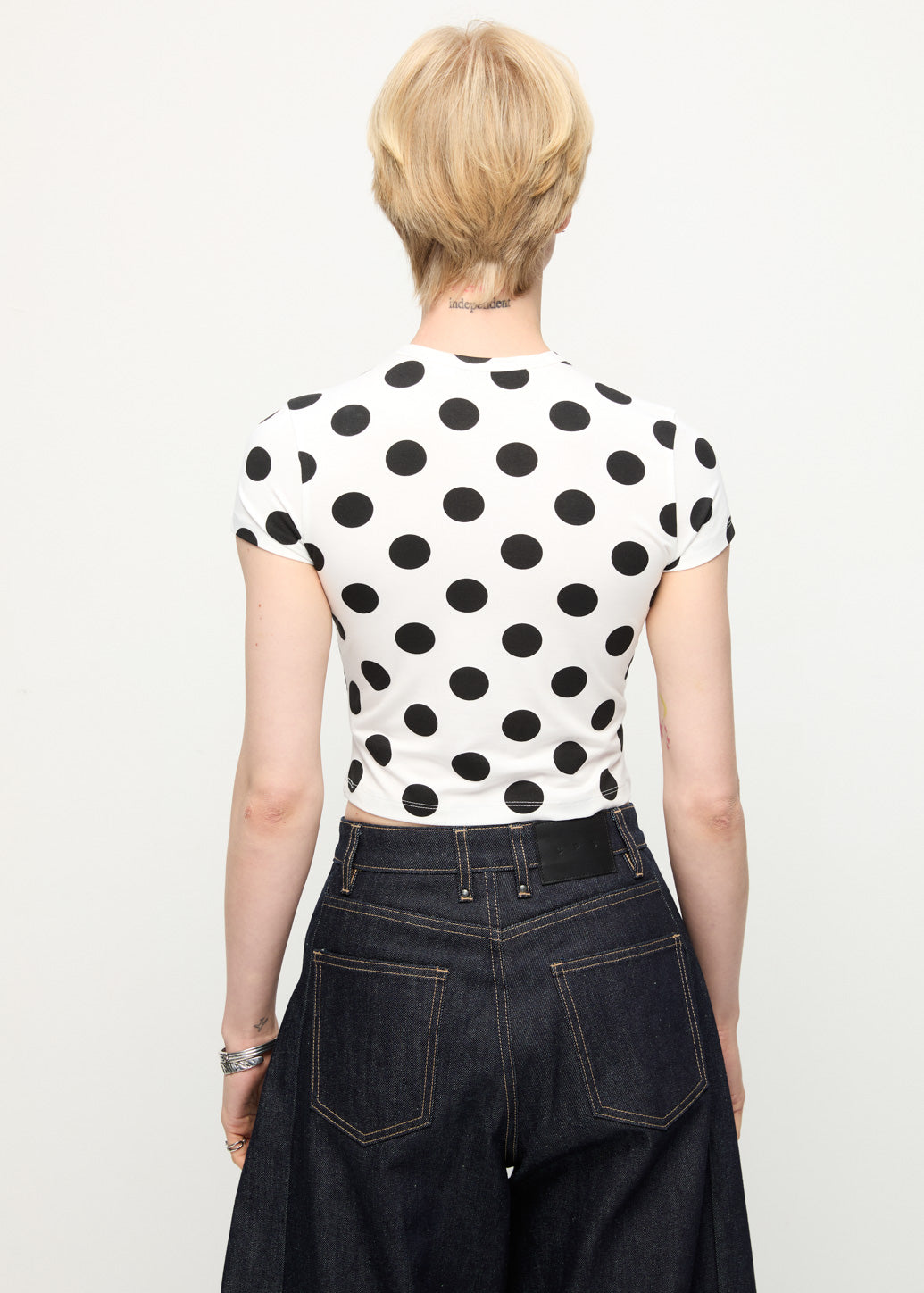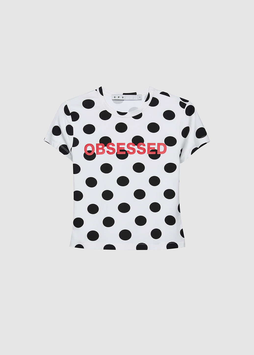 A graphic T-shirt designed with a regular silhouette and classic round neckline. The front features detailed 'Love Addict' typography, while a polka dot pattern adds a festive charm inspired by the Chinese New Year. This piece brings character to seasonal looks while remaining easy to wear.