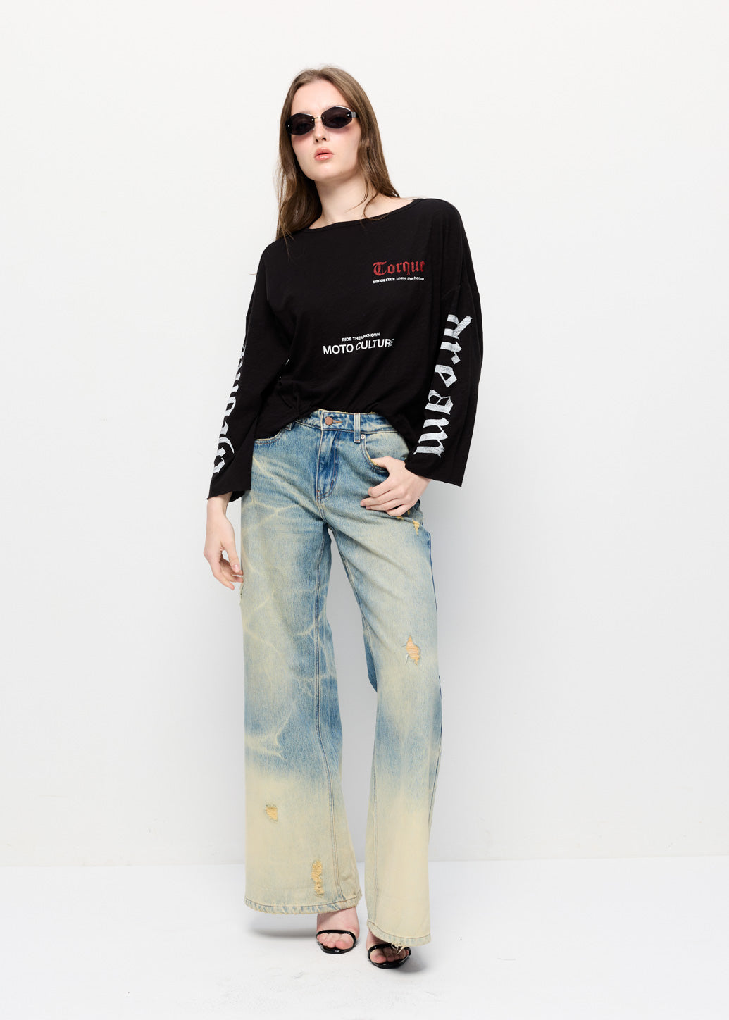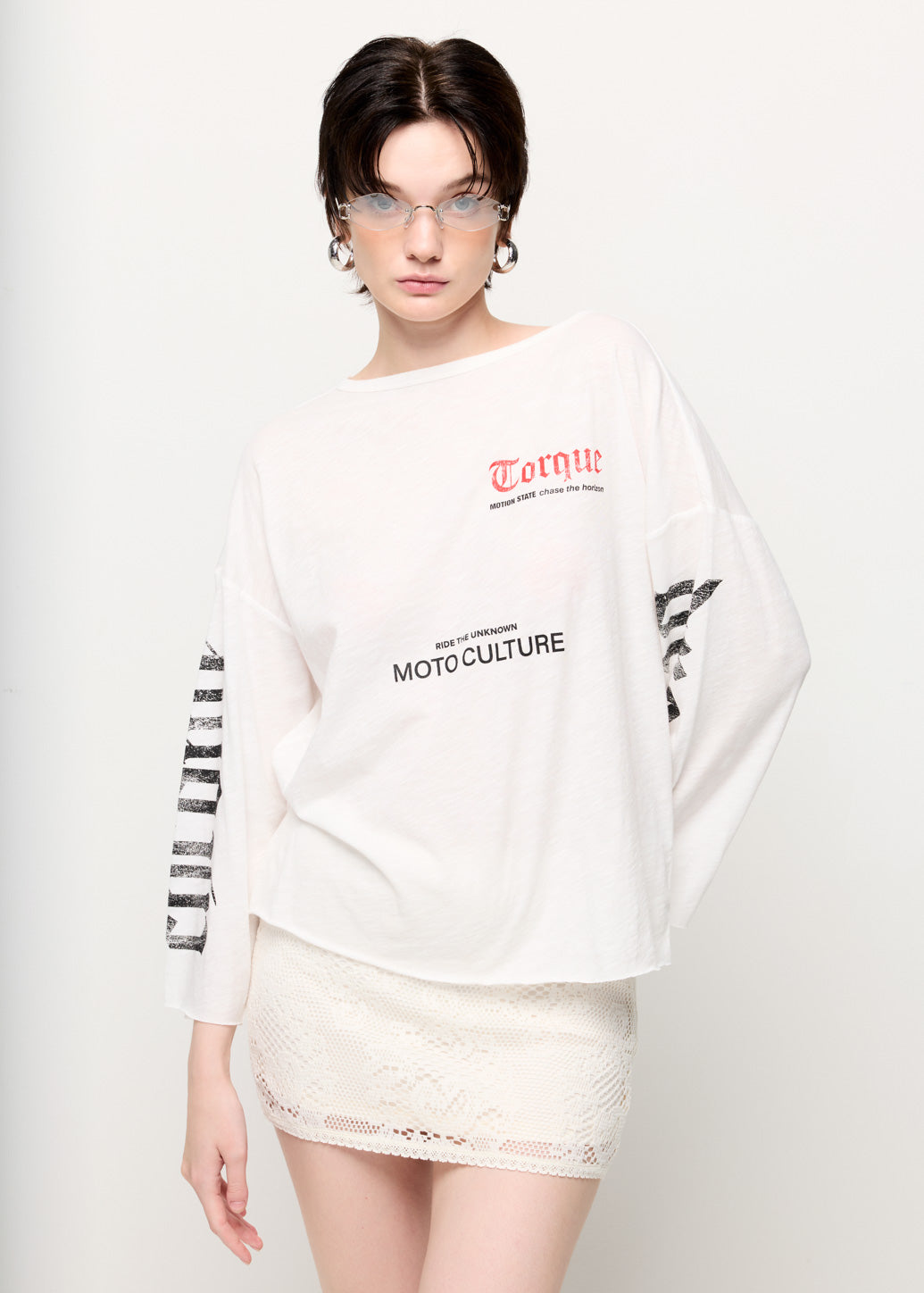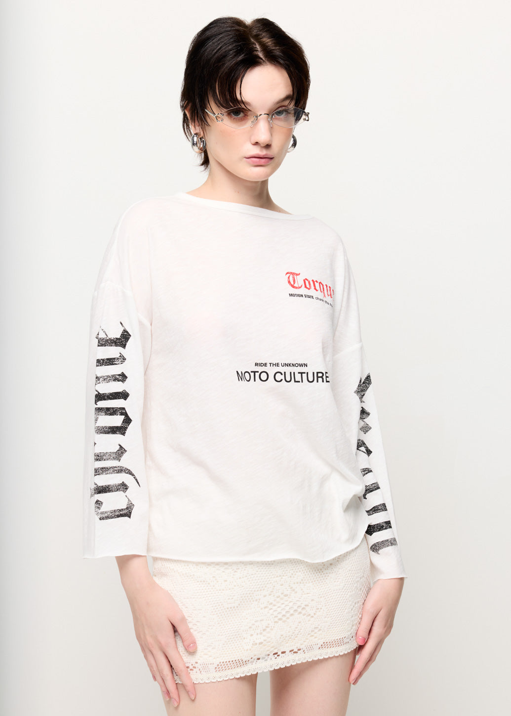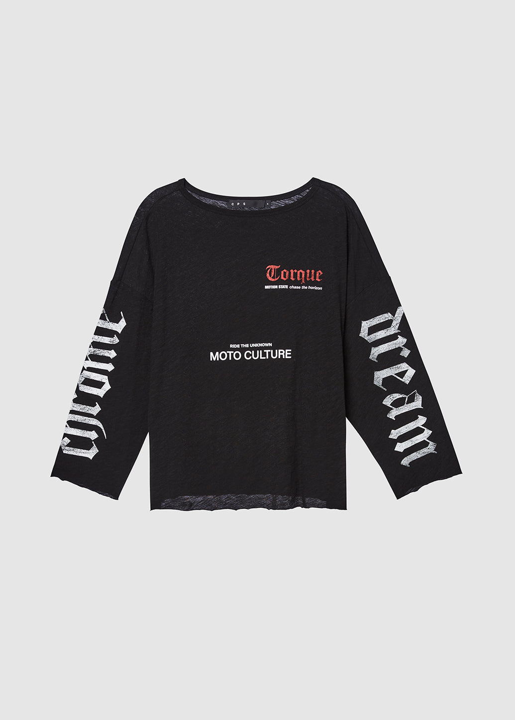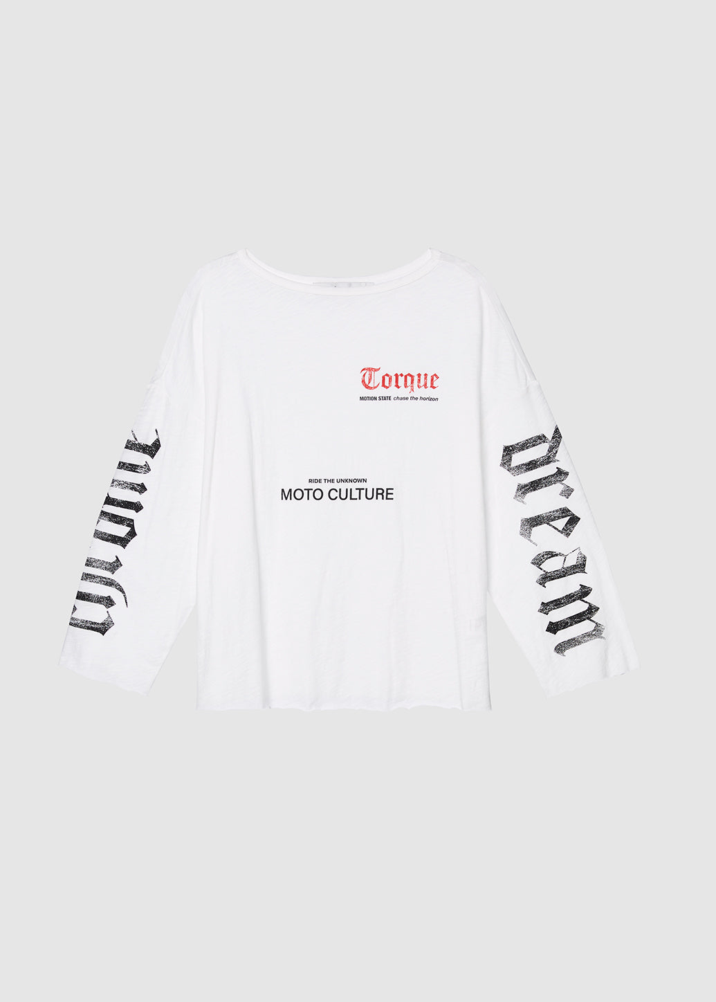 A long-sleeve T-shirt featuring bold 'Torque' and 'MOTO CULTURE' graphics on the front, with statement prints running along both sleeves. Inspired by moto culture, this piece delivers an edgy streetwear vibe while maintaining everyday comfort. Style it effortlessly with denim or cargo pants for a complete street-inspired look.