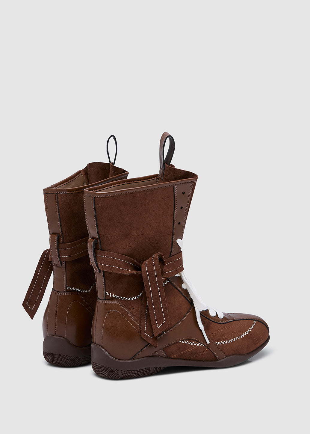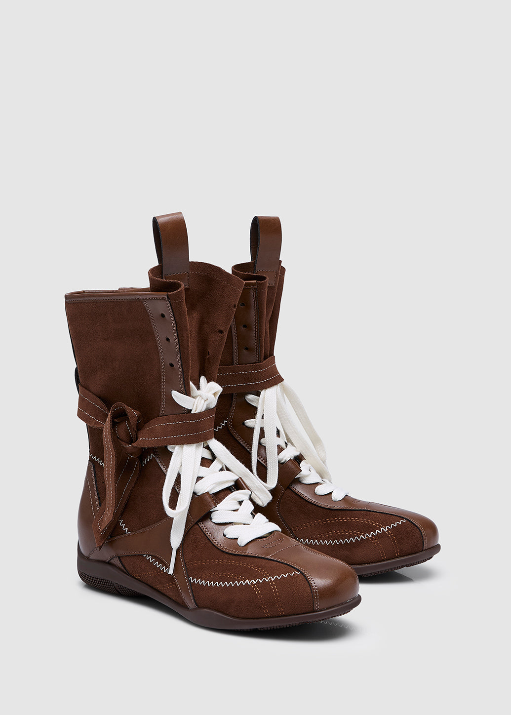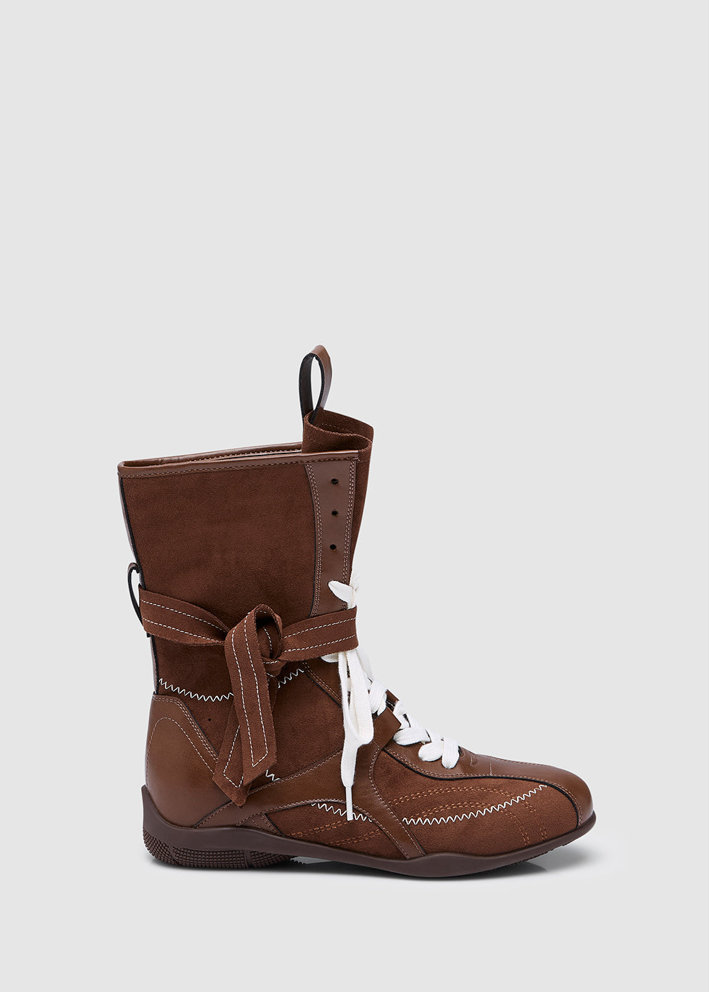 A lace-up sneaker boot in a boxing style, crafted from brown PU material. Features distinctive whipstitch detail and a ribbon tie detail at the ankle. The perfect footwear to achieve a vintage, feminine look.
